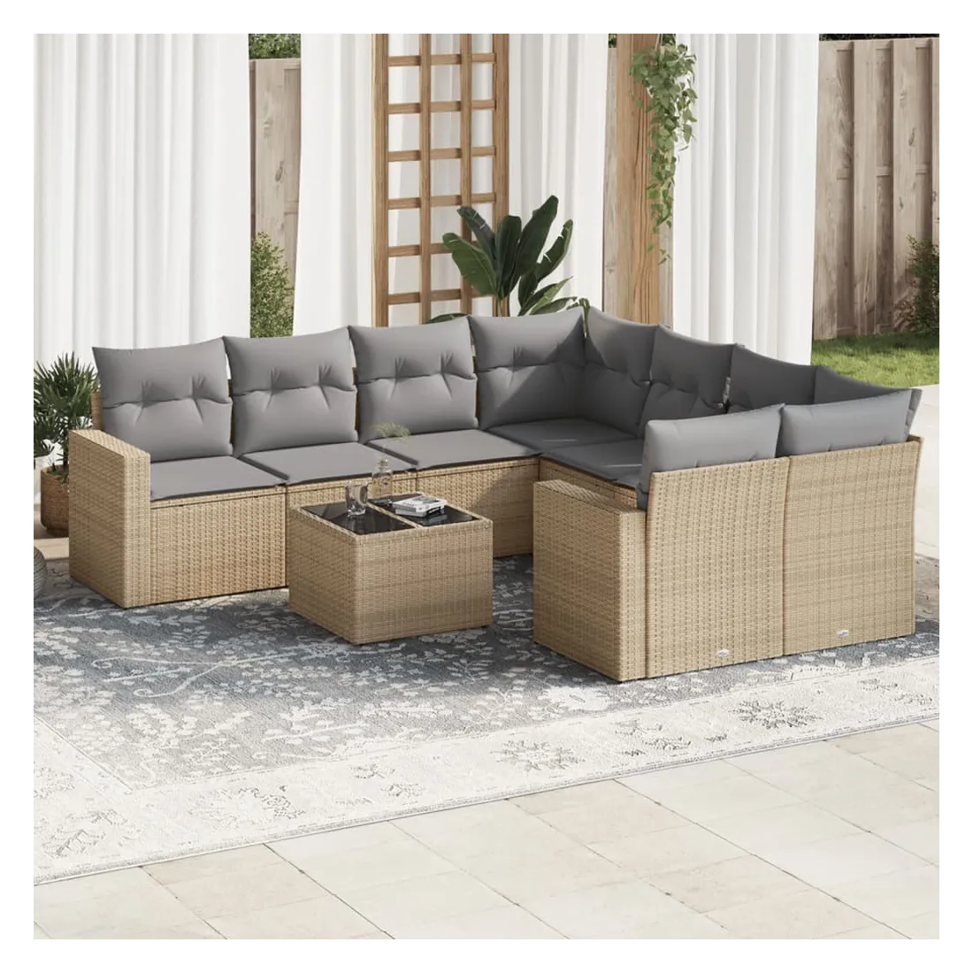 Cet ensemble de canapés de jardin est le complément parfait de votre arrière-cour, terrasse ou patio, offrant un espace confortable et accueillant pour discuter avec la famille et les amis ou simplement se détendre et profiter de l'extérieur. Matériau durable : la résine tressée, également connue sous le nom de poly rotin, est un matériau synthétique solide et nécessitant peu d'entretien qui ressemble au rotin naturel. Il est léger, facile à nettoyer et couramment utilisé pour les meubles d'extérieur en raison de sa durabilité et de ses propriétés de résistance aux intempéries.Expérience d'assise confortable : ce mobilier d'extérieur, doté de coussins épais, offre une expérience d'assise confortable. Les larges accoudoirs offrent également un endroit pratique pour garder votre téléphone portable, vos tasses ou d'autres petits objets à portée de main.Housse amovible et lavable : ces coussins de siège sont dotés de housses amovibles pour un lavage et un entretien faciles.Dessus en verre : le dessus de la table d'extérieur est fabriqué en verre trempé solide et durable, ce qui le rend facile à nettoyer avec un chiffon humide et ajoute une touche d'élégance à votre espace extérieur.Conception modulaire : cet ensemble de meubles d'extérieur a une conception modulaire, ce qui le rend complètement flexible et facile à déplacer, afin que vous puissiez créer un agencement de meubles d'extérieur personnalisé. Bon à savoir :Pour que vos meubles d'extérieur restent beaux, nous vous recommandons de les protéger avec une housse imperméable.
