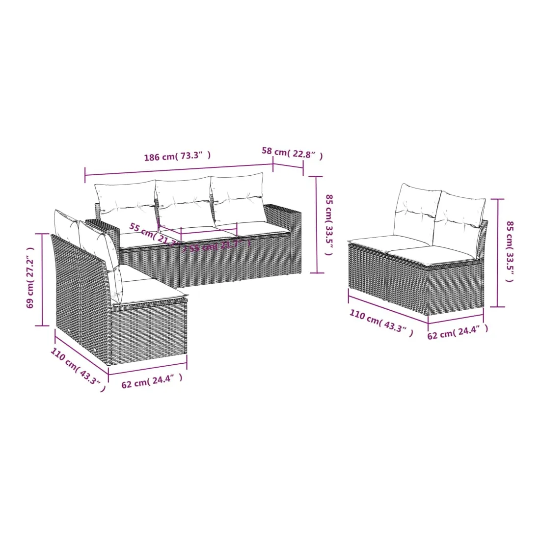 Cet ensemble de canapés de jardin est le complément parfait de votre arrière-cour, terrasse ou patio, offrant un espace confortable et accueillant pour discuter avec la famille et les amis ou simplement se détendre et profiter de l'extérieur. Matériau durable : la résine tressée, également connue sous le nom de poly rotin, est un matériau synthétique solide et nécessitant peu d'entretien qui ressemble au rotin naturel. Il est léger, facile à nettoyer et couramment utilisé pour les meubles d'extérieur en raison de sa durabilité et de ses propriétés de résistance aux intempéries.Expérience d'assise confortable : ce mobilier d'extérieur, doté de coussins épais, offre une expérience d'assise confortable. Les larges accoudoirs offrent également un endroit pratique pour garder votre téléphone portable, vos tasses ou d'autres petits objets à portée de main.Housse amovible et lavable : ces coussins de siège sont dotés de housses amovibles pour un lavage et un entretien faciles.Conception modulaire : cet ensemble de meubles d'extérieur a une conception modulaire, ce qui le rend complètement flexible et facile à déplacer, afin que vous puissiez créer un agencement de meubles d'extérieur personnalisé. Bon à savoir :Pour que vos meubles d'extérieur restent beaux, nous vous recommandons de les protéger avec une housse imperméable.