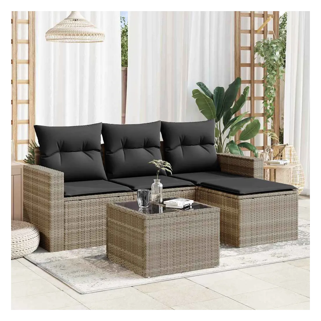Cet ensemble de canapés de jardin est le complément parfait de votre arrière-cour, terrasse ou patio, offrant un espace confortable et accueillant pour discuter avec la famille et les amis ou simplement se détendre et profiter de l'extérieur. Matériau durable : la résine tressée, également connue sous le nom de poly rotin, est un matériau synthétique solide et nécessitant peu d'entretien qui ressemble au rotin naturel. Il est léger, facile à nettoyer et couramment utilisé pour les meubles d'extérieur en raison de sa durabilité et de ses propriétés de résistance aux intempéries.Expérience d'assise confortable : ce mobilier d'extérieur, doté de coussins épais, offre une expérience d'assise confortable. Les larges accoudoirs offrent également un endroit pratique pour garder votre téléphone portable, vos tasses ou d'autres petits objets à portée de main.Housse amovible et lavable : ces coussins de siège sont dotés de housses amovibles pour un lavage et un entretien faciles.Dessus en verre : le dessus de la table d'extérieur est fabriqué en verre trempé solide et durable, ce qui le rend facile à nettoyer avec un chiffon humide et ajoute une touche d'élégance à votre espace extérieur.Conception modulaire : cet ensemble de meubles d'extérieur a une conception modulaire, ce qui le rend complètement flexible et facile à déplacer, afin que vous puissiez créer un agencement de meubles d'extérieur personnalisé. Bon à savoir :Pour que vos meubles d'extérieur restent beaux, nous vous recommandons de les protéger avec une housse imperméable.
