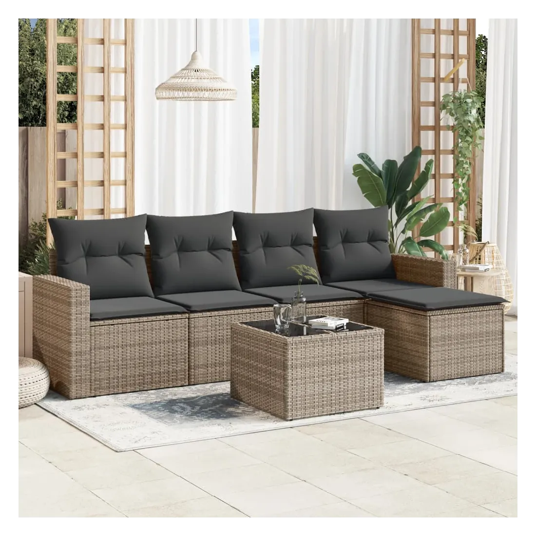 Cet ensemble de canapés de jardin est le complément parfait de votre arrière-cour, terrasse ou patio, offrant un espace confortable et accueillant pour discuter avec la famille et les amis ou simplement se détendre et profiter de l'extérieur. Matériau durable : la résine tressée, également connue sous le nom de poly rotin, est un matériau synthétique solide et nécessitant peu d'entretien qui ressemble au rotin naturel. Il est léger, facile à nettoyer et couramment utilisé pour les meubles d'extérieur en raison de sa durabilité et de ses propriétés de résistance aux intempéries.Expérience d'assise confortable : ce mobilier d'extérieur, doté de coussins épais, offre une expérience d'assise confortable. Les larges accoudoirs offrent également un endroit pratique pour garder votre téléphone portable, vos tasses ou d'autres petits objets à portée de main.Housse amovible et lavable : ces coussins de siège sont dotés de housses amovibles pour un lavage et un entretien faciles.Dessus en verre : le dessus de la table d'extérieur est fabriqué en verre trempé solide et durable, ce qui le rend facile à nettoyer avec un chiffon humide et ajoute une touche d'élégance à votre espace extérieur.Conception modulaire : cet ensemble de meubles d'extérieur a une conception modulaire, ce qui le rend complètement flexible et facile à déplacer, afin que vous puissiez créer un agencement de meubles d'extérieur personnalisé. Bon à savoir :Pour que vos meubles d'extérieur restent beaux, nous vous recommandons de les protéger avec une housse imperméable.