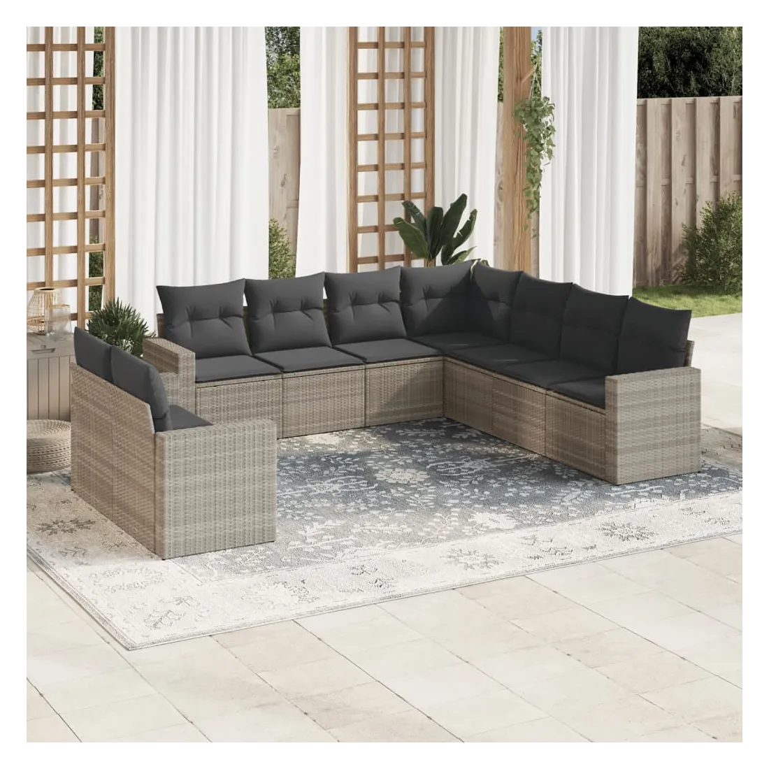 Cet ensemble de canapés de jardin est le complément parfait de votre arrière-cour, terrasse ou patio, offrant un espace confortable et accueillant pour discuter avec la famille et les amis ou simplement se détendre et profiter de l'extérieur. Matériau durable : la résine tressée, également connue sous le nom de poly rotin, est un matériau synthétique solide et nécessitant peu d'entretien qui ressemble au rotin naturel. Il est léger, facile à nettoyer et couramment utilisé pour les meubles d'extérieur en raison de sa durabilité et de ses propriétés de résistance aux intempéries.Expérience d'assise confortable : ce mobilier d'extérieur, doté de coussins épais, offre une expérience d'assise confortable. Les larges accoudoirs offrent également un endroit pratique pour garder votre téléphone portable, vos tasses ou d'autres petits objets à portée de main.Housse amovible et lavable : ces coussins de siège sont dotés de housses amovibles pour un lavage et un entretien faciles.Conception modulaire : cet ensemble de meubles d'extérieur a une conception modulaire, ce qui le rend complètement flexible et facile à déplacer, afin que vous puissiez créer un agencement de meubles d'extérieur personnalisé. Bon à savoir :Pour que vos meubles d'extérieur restent beaux, nous vous recommandons de les protéger avec une housse imperméable.