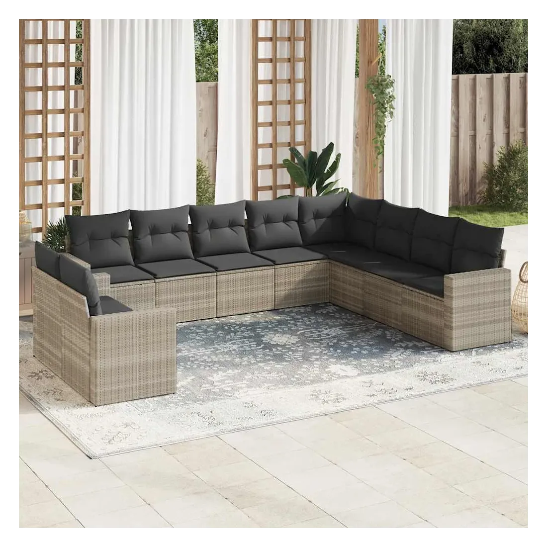 Cet ensemble de canapés de jardin est le complément parfait de votre arrière-cour, terrasse ou patio, offrant un espace confortable et accueillant pour discuter avec la famille et les amis ou simplement se détendre et profiter de l'extérieur. Matériau durable : la résine tressée, également connue sous le nom de poly rotin, est un matériau synthétique solide et nécessitant peu d'entretien qui ressemble au rotin naturel. Il est léger, facile à nettoyer et couramment utilisé pour les meubles d'extérieur en raison de sa durabilité et de ses propriétés de résistance aux intempéries.Expérience d'assise confortable : ce mobilier d'extérieur, doté de coussins épais, offre une expérience d'assise confortable. Les larges accoudoirs offrent également un endroit pratique pour garder votre téléphone portable, vos tasses ou d'autres petits objets à portée de main.Housse amovible et lavable : ces coussins de siège sont dotés de housses amovibles pour un lavage et un entretien faciles.Conception modulaire : cet ensemble de meubles d'extérieur a une conception modulaire, ce qui le rend complètement flexible et facile à déplacer, afin que vous puissiez créer un agencement de meubles d'extérieur personnalisé. Bon à savoir :Pour que vos meubles d'extérieur restent beaux, nous vous recommandons de les protéger avec une housse imperméable.