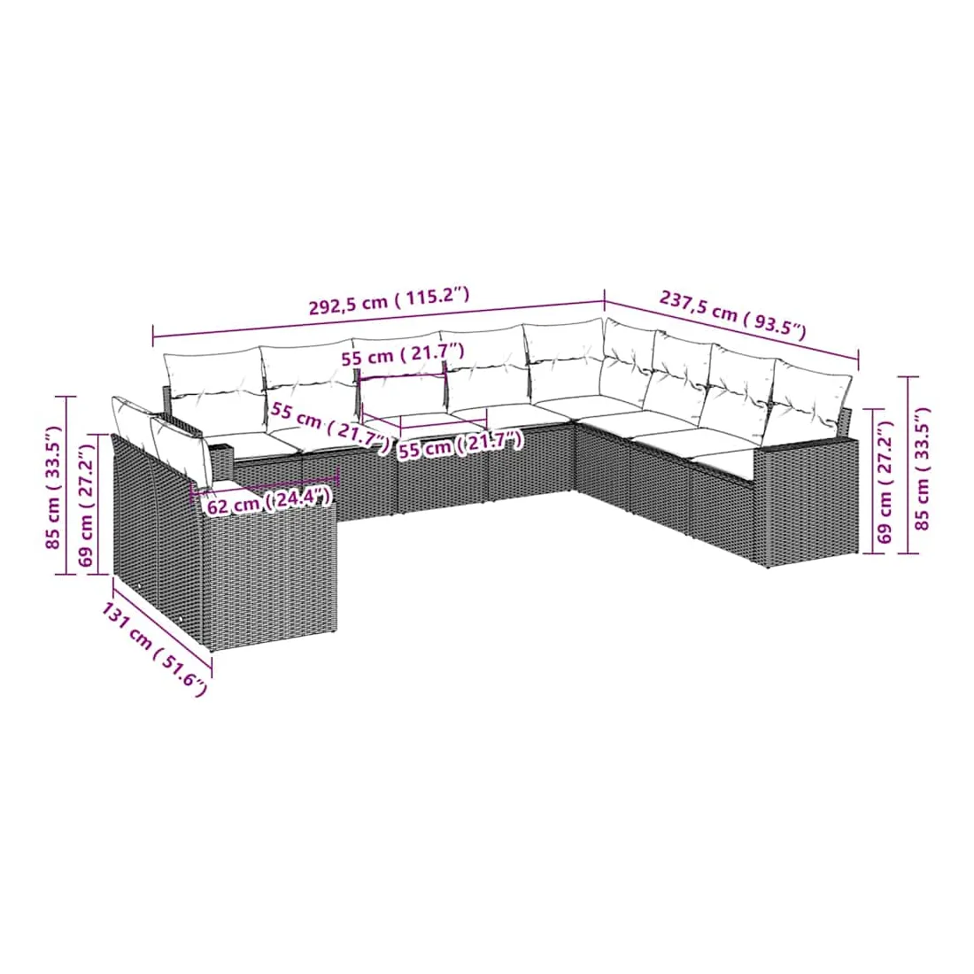 - Dimensions du coussin de dossier : 55 x 45 x 13 cm (L x l x é)