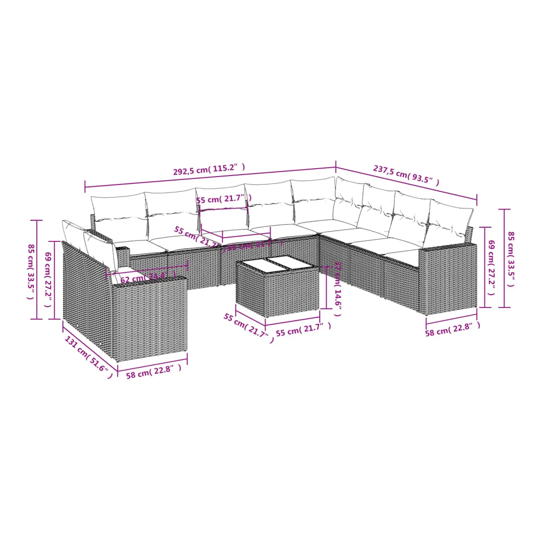 - Dimensions du coussin de dossier : 55 x 45 x 13 cm (L x l x é)
