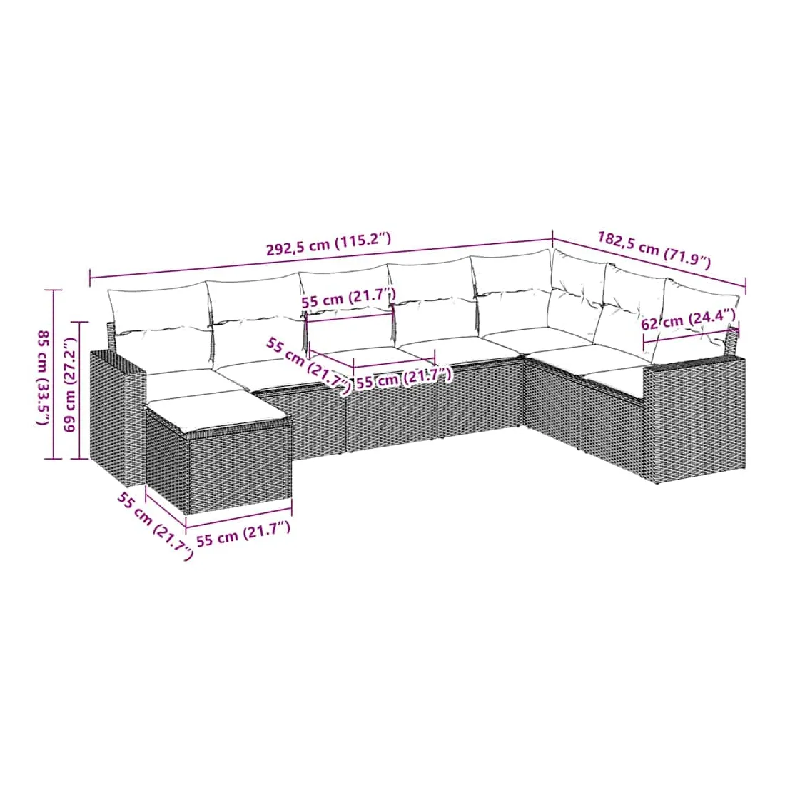 Cet ensemble de canapés de jardin est le complément parfait de votre arrière-cour, terrasse ou patio, offrant un espace confortable et accueillant pour discuter avec la famille et les amis ou simplement se détendre et profiter de l'extérieur. Matériau durable : la résine tressée, également connue sous le nom de poly rotin, est un matériau synthétique solide et nécessitant peu d'entretien qui ressemble au rotin naturel. Il est léger, facile à nettoyer et couramment utilisé pour les meubles d'extérieur en raison de sa durabilité et de ses propriétés de résistance aux intempéries.Expérience d'assise confortable : ce mobilier d'extérieur, doté de coussins épais, offre une expérience d'assise confortable. Les larges accoudoirs offrent également un endroit pratique pour garder votre téléphone portable, vos tasses ou d'autres petits objets à portée de main.Housse amovible et lavable : ces coussins de siège sont dotés de housses amovibles pour un lavage et un entretien faciles.Conception modulaire : cet ensemble de meubles d'extérieur a une conception modulaire, ce qui le rend complètement flexible et facile à déplacer, afin que vous puissiez créer un agencement de meubles d'extérieur personnalisé. Bon à savoir :Pour que vos meubles d'extérieur restent beaux, nous vous recommandons de les protéger avec une housse imperméable.