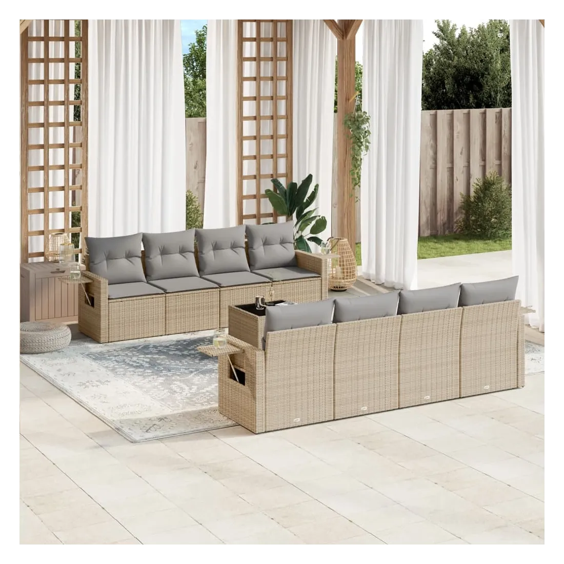Cet ensemble de canapés de jardin est le complément parfait de votre arrière-cour, terrasse ou patio, offrant un espace confortable et accueillant pour discuter avec la famille et les amis ou simplement se détendre et profiter de l'extérieur. Matériau durable : la résine tressée, également connue sous le nom de poly rotin, est un matériau synthétique solide et nécessitant peu d'entretien qui ressemble au rotin naturel. Il est léger, facile à nettoyer et couramment utilisé pour les meubles d'extérieur en raison de sa durabilité et de ses propriétés de résistance aux intempéries.Dessus en verre : le dessus de la table d'extérieur est fabriqué en verre trempé solide et durable, ce qui le rend facile à nettoyer avec un chiffon humide et ajoute une touche d'élégance à votre espace extérieur. Table d'appoint pratique : ce mobilier d'extérieur comprend des tables d'appoint pliables avec un ressort à gaz sur les accoudoirs, offrant des endroits pratiques pour garder vos essentiels à portée de main. Expérience d'assise confortable : ce mobilier d'extérieur, doté de coussins épais, offre une expérience d'assise confortable.Conception modulaire : cet ensemble de meubles d'extérieur a une conception modulaire, ce qui le rend complètement flexible et facile à déplacer, afin que vous puissiez créer un agencement de meubles d'extérieur personnalisé. Bon à savoir :Pour que vos meubles d'extérieur restent beaux, nous vous recommandons de les protéger avec une housse imperméable.