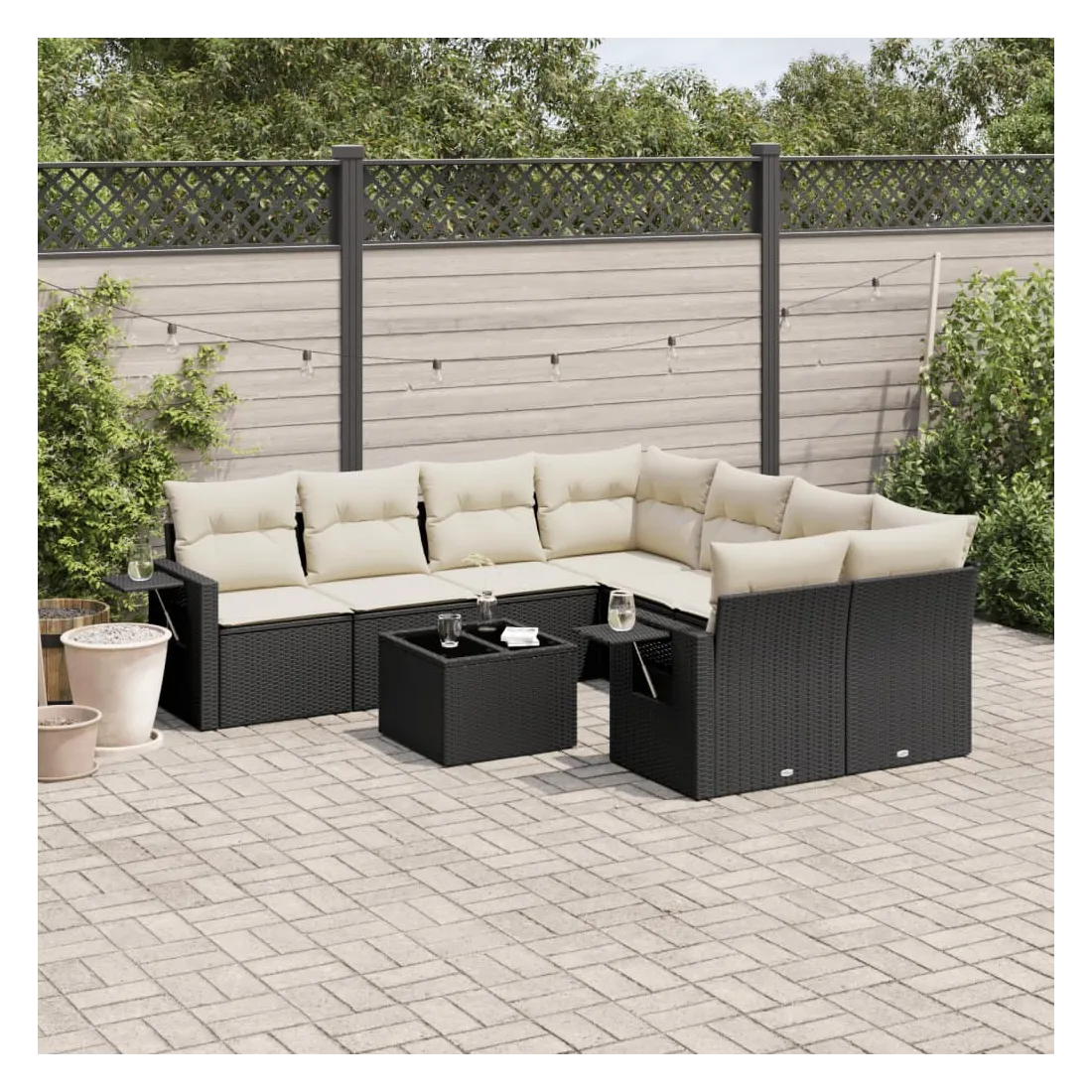 Cet ensemble de canapés de jardin est le complément parfait de votre arrière-cour, terrasse ou patio, offrant un espace confortable et accueillant pour discuter avec la famille et les amis ou simplement se détendre et profiter de l'extérieur. Matériau durable : la résine tressée, également connue sous le nom de poly rotin, est un matériau synthétique solide et nécessitant peu d'entretien qui ressemble au rotin naturel. Il est léger, facile à nettoyer et couramment utilisé pour les meubles d'extérieur en raison de sa durabilité et de ses propriétés de résistance aux intempéries.Dessus en verre : le dessus de la table d'extérieur est fabriqué en verre trempé solide et durable, ce qui le rend facile à nettoyer avec un chiffon humide et ajoute une touche d'élégance à votre espace extérieur. Table d'appoint pratique : ce mobilier d'extérieur comprend des tables d'appoint pliables avec un ressort à gaz sur les accoudoirs, offrant des endroits pratiques pour garder vos essentiels à portée de main. Expérience d'assise confortable : ce mobilier d'extérieur, doté de coussins épais, offre une expérience d'assise confortable.Conception modulaire : cet ensemble de meubles d'extérieur a une conception modulaire, ce qui le rend complètement flexible et facile à déplacer, afin que vous puissiez créer un agencement de meubles d'extérieur personnalisé. Bon à savoir :Pour que vos meubles d'extérieur restent beaux, nous vous recommandons de les protéger avec une housse imperméable.