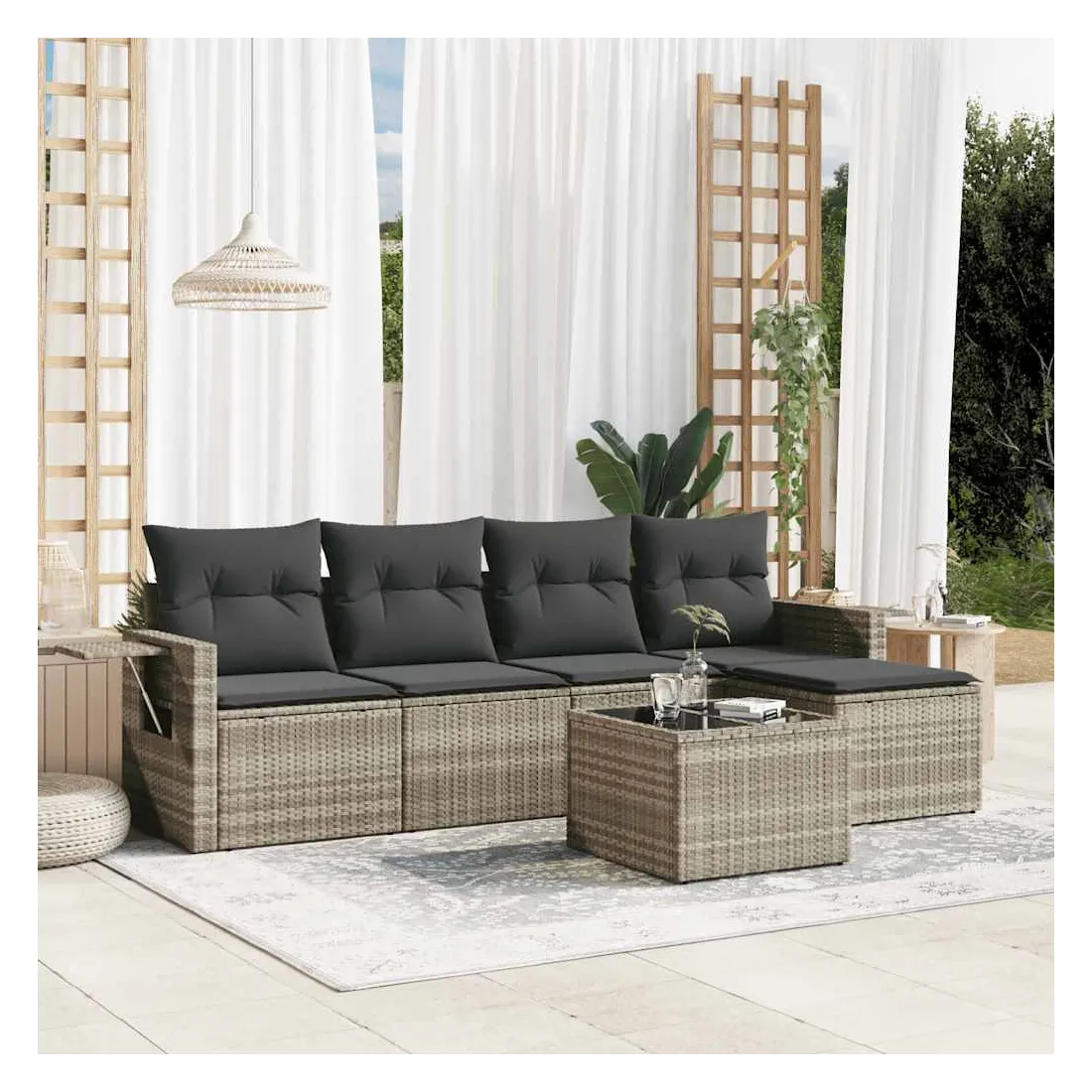 Cet ensemble de canapés de jardin est le complément parfait de votre arrière-cour, terrasse ou patio, offrant un espace confortable et accueillant pour discuter avec la famille et les amis ou simplement se détendre et profiter de l'extérieur. Matériau durable : la résine tressée, également connue sous le nom de poly rotin, est un matériau synthétique solide et nécessitant peu d'entretien qui ressemble au rotin naturel. Il est léger, facile à nettoyer et couramment utilisé pour les meubles d'extérieur en raison de sa durabilité et de ses propriétés de résistance aux intempéries.Dessus en verre : le dessus de la table d'extérieur est fabriqué en verre trempé solide et durable, ce qui le rend facile à nettoyer avec un chiffon humide et ajoute une touche d'élégance à votre espace extérieur. Table d'appoint pratique : ce mobilier d'extérieur comprend des tables d'appoint pliables avec un ressort à gaz sur les accoudoirs, offrant des endroits pratiques pour garder vos essentiels à portée de main. Expérience d'assise confortable : ce mobilier d'extérieur, doté de coussins épais, offre une expérience d'assise confortable.Conception modulaire : cet ensemble de meubles d'extérieur a une conception modulaire, ce qui le rend complètement flexible et facile à déplacer, afin que vous puissiez créer un agencement de meubles d'extérieur personnalisé. Bon à savoir :Pour que vos meubles d'extérieur restent beaux, nous vous recommandons de les protéger avec une housse imperméable.