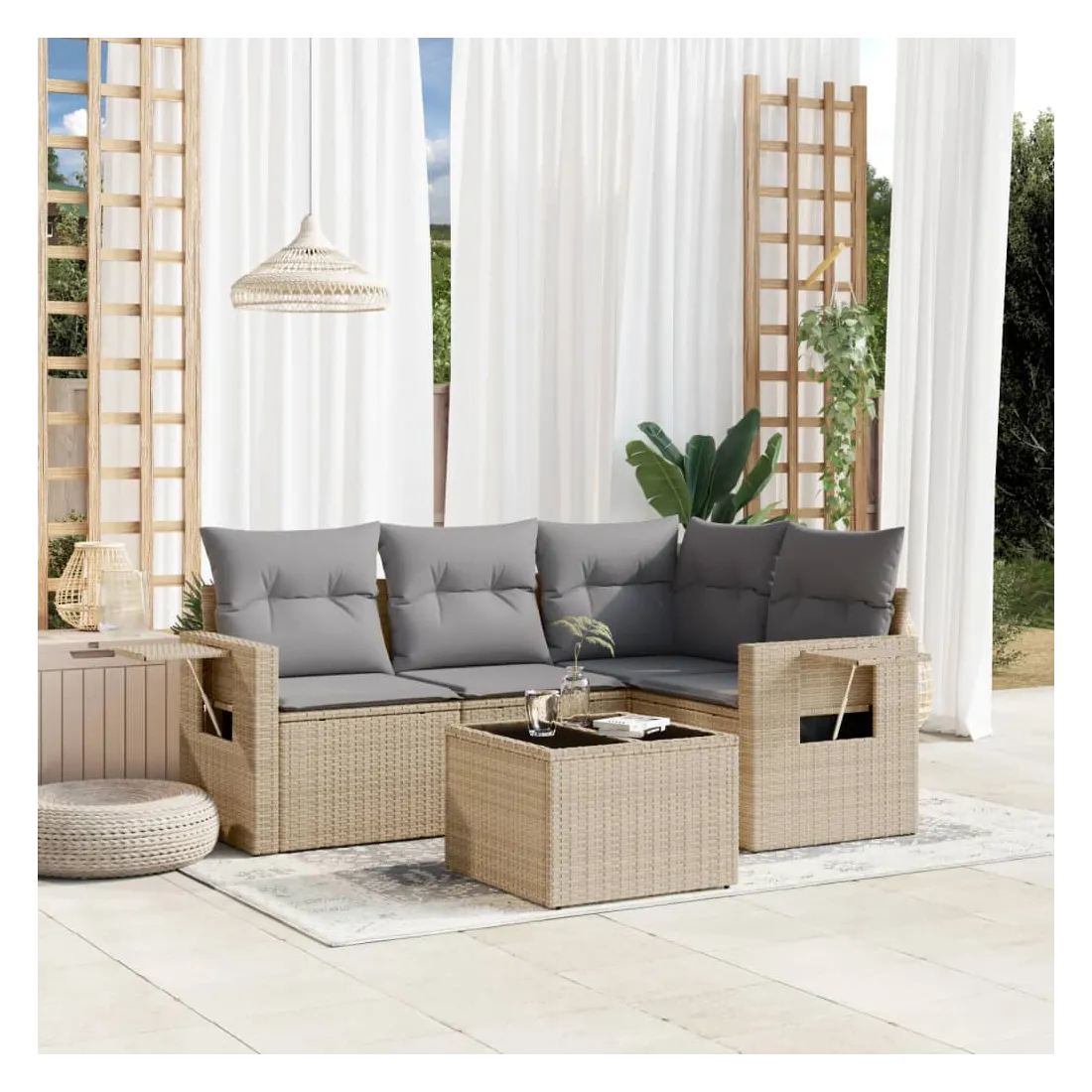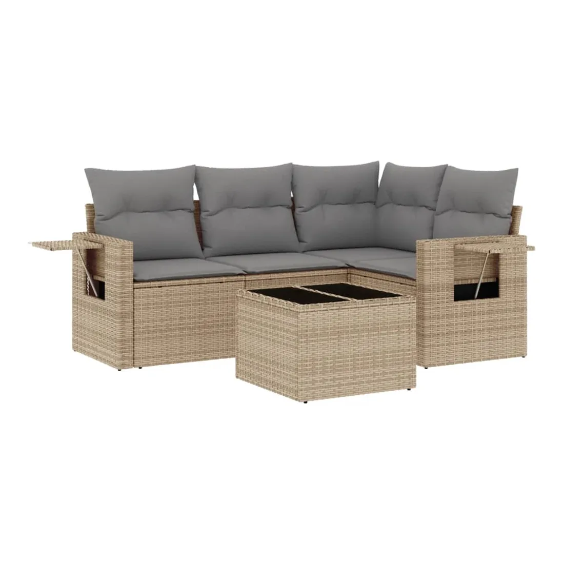 Cet ensemble de canapés de jardin est le complément parfait de votre arrière-cour, terrasse ou patio, offrant un espace confortable et accueillant pour discuter avec la famille et les amis ou simplement se détendre et profiter de l'extérieur. Matériau durable : la résine tressée, également connue sous le nom de poly rotin, est un matériau synthétique solide et nécessitant peu d'entretien qui ressemble au rotin naturel. Il est léger, facile à nettoyer et couramment utilisé pour les meubles d'extérieur en raison de sa durabilité et de ses propriétés de résistance aux intempéries.Dessus en verre : le dessus de la table d'extérieur est fabriqué en verre trempé solide et durable, ce qui le rend facile à nettoyer avec un chiffon humide et ajoute une touche d'élégance à votre espace extérieur. Table d'appoint pratique : ce mobilier d'extérieur comprend des tables d'appoint pliables avec un ressort à gaz sur les accoudoirs, offrant des endroits pratiques pour garder vos essentiels à portée de main. Expérience d'assise confortable : ce mobilier d'extérieur, doté de coussins épais, offre une expérience d'assise confortable.Conception modulaire : cet ensemble de meubles d'extérieur a une conception modulaire, ce qui le rend complètement flexible et facile à déplacer, afin que vous puissiez créer un agencement de meubles d'extérieur personnalisé. Bon à savoir :Pour que vos meubles d'extérieur restent beaux, nous vous recommandons de les protéger avec une housse imperméable.