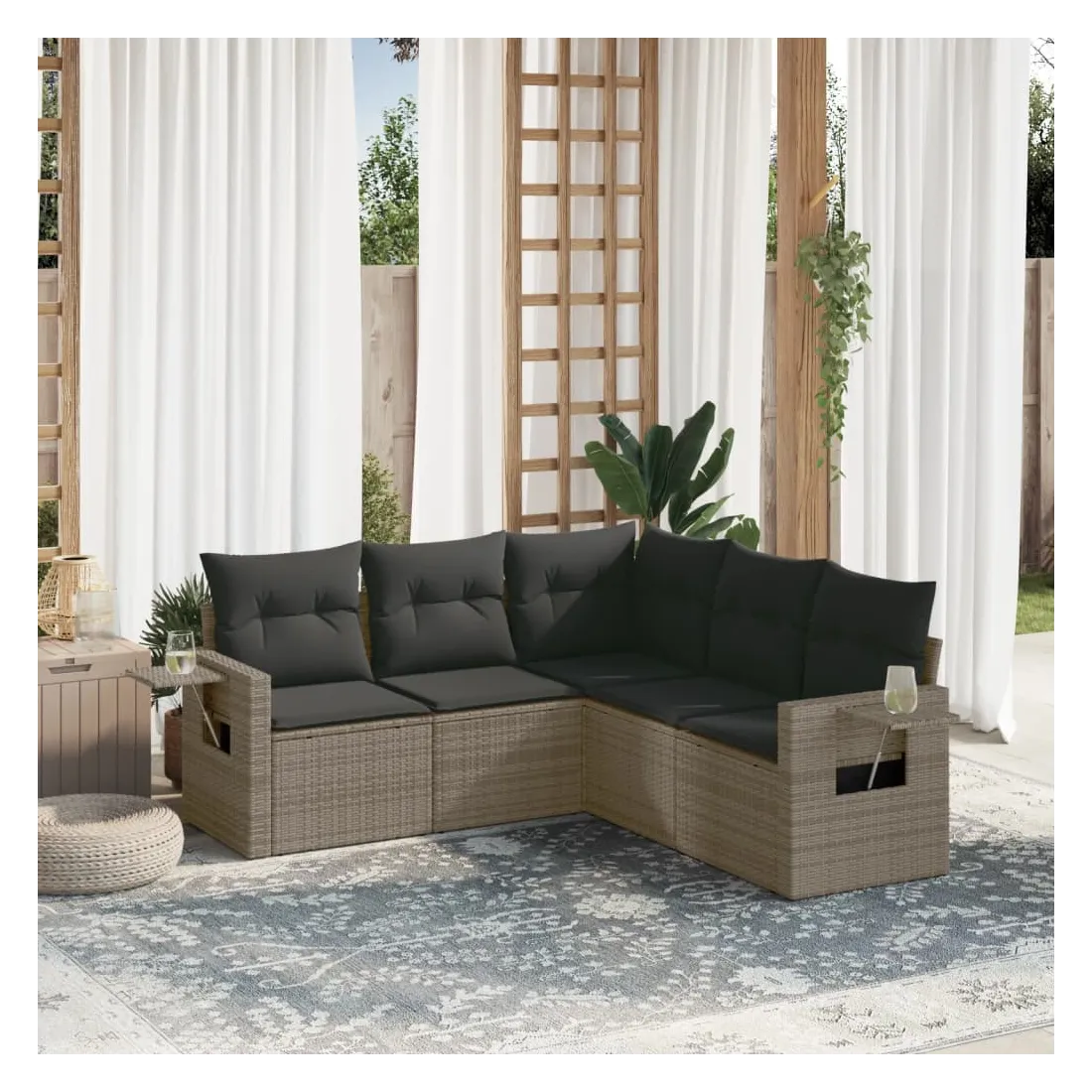 Cet ensemble de canapés de jardin est le complément parfait de votre arrière-cour, terrasse ou patio, offrant un espace confortable et accueillant pour discuter avec la famille et les amis ou simplement se détendre et profiter de l'extérieur. Matériau durable : la résine tressée, également connue sous le nom de poly rotin, est un matériau synthétique solide et nécessitant peu d'entretien qui ressemble au rotin naturel. Il est léger, facile à nettoyer et couramment utilisé pour les meubles d'extérieur en raison de sa durabilité et de ses propriétés de résistance aux intempéries. Table d'appoint pratique : ce mobilier d'extérieur comprend des tables d'appoint pliables avec un ressort à gaz sur les accoudoirs, offrant des endroits pratiques pour garder vos essentiels à portée de main. Expérience d'assise confortable : ce mobilier d'extérieur, doté de coussins épais, offre une expérience d'assise confortable. Housse amovible et lavable : ces coussins de siège sont dotés de housses amovibles pour un lavage et un entretien faciles.Conception modulaire : cet ensemble de meubles d'extérieur a une conception modulaire, ce qui le rend complètement flexible et facile à déplacer, afin que vous puissiez créer un agencement de meubles d'extérieur personnalisé. Bon à savoir :Pour que vos meubles d'extérieur restent beaux, nous vous recommandons de les protéger avec une housse imperméable.