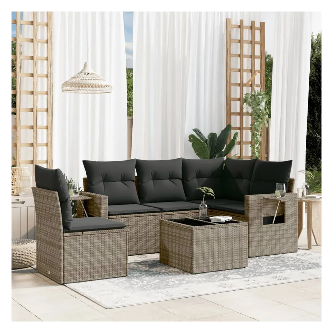 Cet ensemble de canapés de jardin est le complément parfait de votre arrière-cour, terrasse ou patio, offrant un espace confortable et accueillant pour discuter avec la famille et les amis ou simplement se détendre et profiter de l'extérieur. Matériau durable : la résine tressée, également connue sous le nom de poly rotin, est un matériau synthétique solide et nécessitant peu d'entretien qui ressemble au rotin naturel. Il est léger, facile à nettoyer et couramment utilisé pour les meubles d'extérieur en raison de sa durabilité et de ses propriétés de résistance aux intempéries.Dessus en verre : le dessus de la table d'extérieur est fabriqué en verre trempé solide et durable, ce qui le rend facile à nettoyer avec un chiffon humide et ajoute une touche d'élégance à votre espace extérieur. Table d'appoint pratique : ce mobilier d'extérieur comprend des tables d'appoint pliables avec un ressort à gaz sur les accoudoirs, offrant des endroits pratiques pour garder vos essentiels à portée de main. Expérience d'assise confortable : ce mobilier d'extérieur, doté de coussins épais, offre une expérience d'assise confortable.Conception modulaire : cet ensemble de meubles d'extérieur a une conception modulaire, ce qui le rend complètement flexible et facile à déplacer, afin que vous puissiez créer un agencement de meubles d'extérieur personnalisé. Bon à savoir :Pour que vos meubles d'extérieur restent beaux, nous vous recommandons de les protéger avec une housse imperméable.