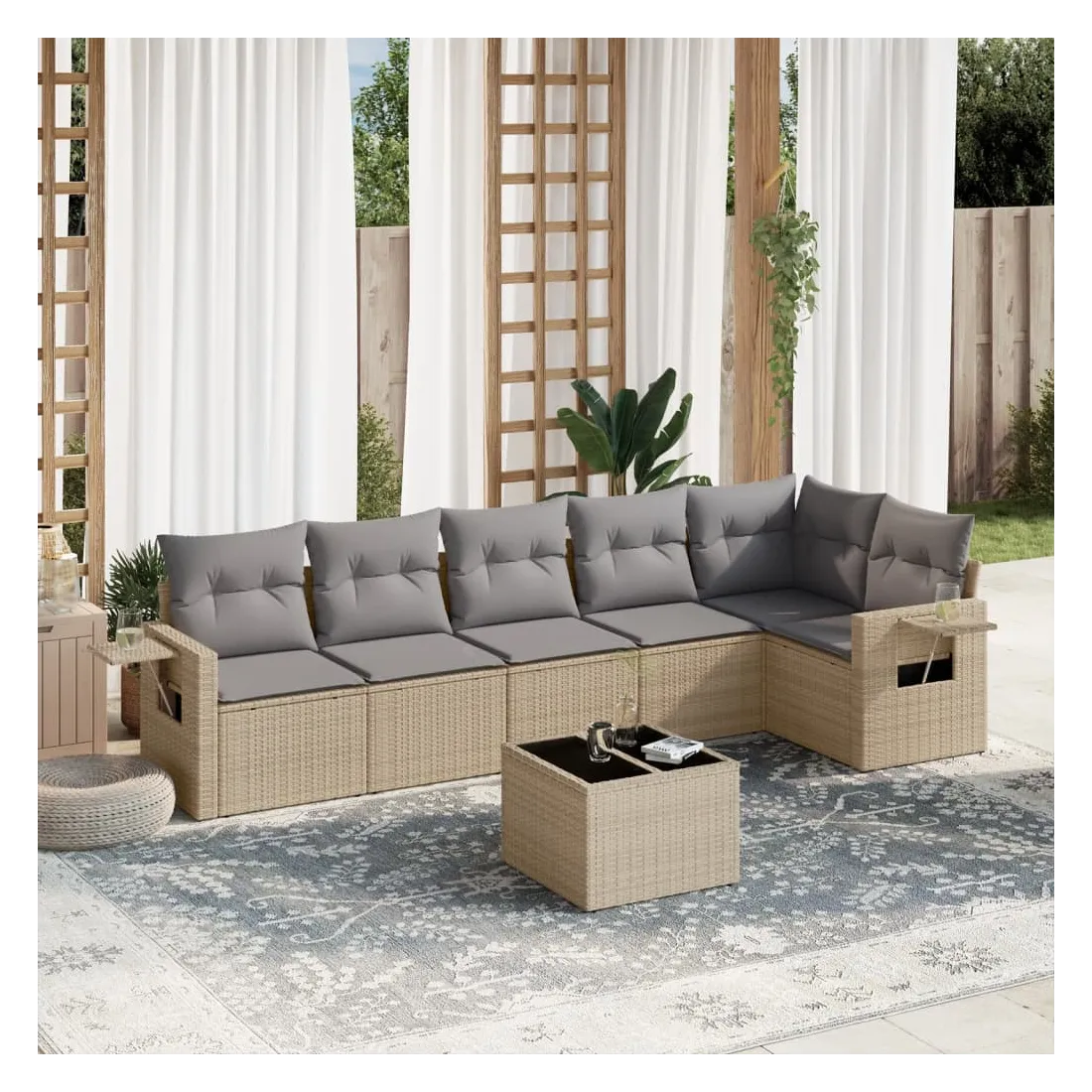 Cet ensemble de canapés de jardin est le complément parfait de votre arrière-cour, terrasse ou patio, offrant un espace confortable et accueillant pour discuter avec la famille et les amis ou simplement se détendre et profiter de l'extérieur. Matériau durable : la résine tressée, également connue sous le nom de poly rotin, est un matériau synthétique solide et nécessitant peu d'entretien qui ressemble au rotin naturel. Il est léger, facile à nettoyer et couramment utilisé pour les meubles d'extérieur en raison de sa durabilité et de ses propriétés de résistance aux intempéries.Dessus en verre : le dessus de la table d'extérieur est fabriqué en verre trempé solide et durable, ce qui le rend facile à nettoyer avec un chiffon humide et ajoute une touche d'élégance à votre espace extérieur. Table d'appoint pratique : ce mobilier d'extérieur comprend des tables d'appoint pliables avec un ressort à gaz sur les accoudoirs, offrant des endroits pratiques pour garder vos essentiels à portée de main. Expérience d'assise confortable : ce mobilier d'extérieur, doté de coussins épais, offre une expérience d'assise confortable.Conception modulaire : cet ensemble de meubles d'extérieur a une conception modulaire, ce qui le rend complètement flexible et facile à déplacer, afin que vous puissiez créer un agencement de meubles d'extérieur personnalisé. Bon à savoir :Pour que vos meubles d'extérieur restent beaux, nous vous recommandons de les protéger avec une housse imperméable.