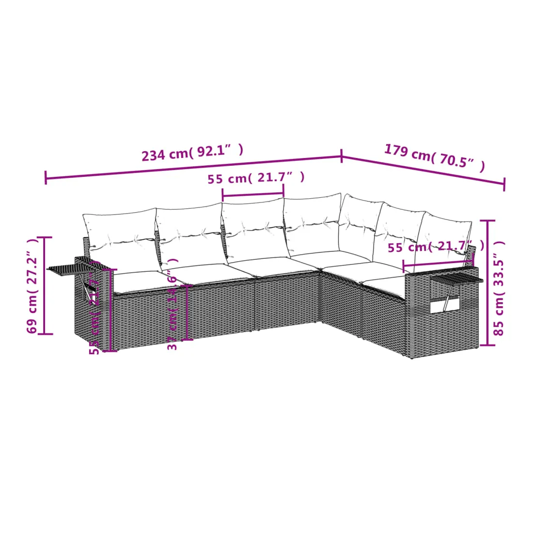 Cet ensemble de canapés de jardin est le complément parfait de votre arrière-cour, terrasse ou patio, offrant un espace confortable et accueillant pour discuter avec la famille et les amis ou simplement se détendre et profiter de l'extérieur. Matériau durable : la résine tressée, également connue sous le nom de poly rotin, est un matériau synthétique solide et nécessitant peu d'entretien qui ressemble au rotin naturel. Elle est légère, facile à nettoyer et couramment utilisée pour les meubles d'extérieur en raison de sa durabilité et de ses propriétés de résistance aux intempéries. Table d'appoint pratique : ce mobilier d'extérieur comprend des tables d'appoint pliables avec un ressort à gaz sur les accoudoirs, offrant des endroits pratiques pour garder vos essentiels à portée de main. Expérience d'assise confortable : ce mobilier d'extérieur, doté de coussins épais, offre une expérience d'assise confortable. Housse amovible et lavable : ces coussins de siège sont dotés de housses amovibles pour un lavage et un entretien faciles.Conception modulaire : cet ensemble de meubles d'extérieur a une conception modulaire, ce qui le rend complètement flexible et facile à déplacer, afin que vous puissiez créer un agencement de meubles d'extérieur personnalisé. Bon à savoir :Pour que vos meubles d'extérieur restent beaux, nous vous recommandons de les protéger avec une housse imperméable.