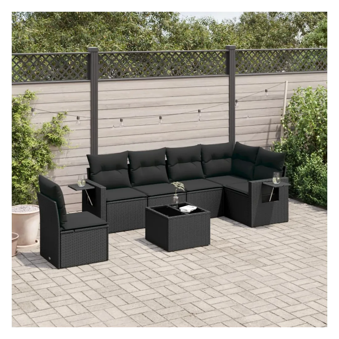 Salon de jardin 7 pcs avec coussins noir résine tressée