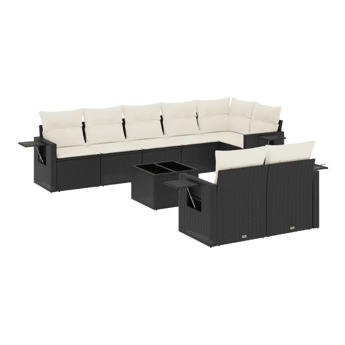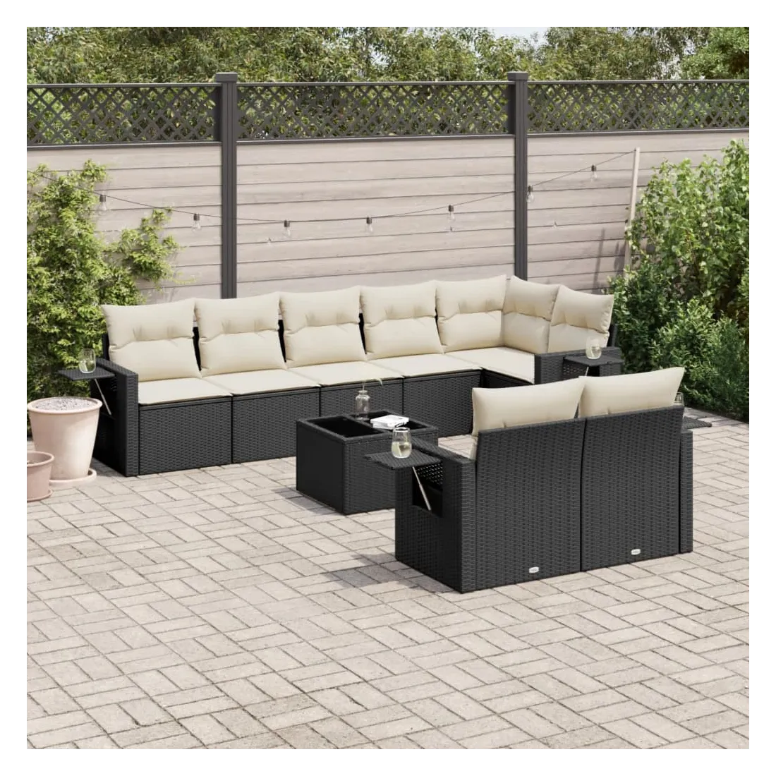 Cet ensemble de canapés de jardin est le complément parfait de votre arrière-cour, terrasse ou patio, offrant un espace confortable et accueillant pour discuter avec la famille et les amis ou simplement se détendre et profiter de l'extérieur. Matériau durable : la résine tressée, également connue sous le nom de poly rotin, est un matériau synthétique solide et nécessitant peu d'entretien qui ressemble au rotin naturel. Il est léger, facile à nettoyer et couramment utilisé pour les meubles d'extérieur en raison de sa durabilité et de ses propriétés de résistance aux intempéries.Dessus en verre : le dessus de la table d'extérieur est fabriqué en verre trempé solide et durable, ce qui le rend facile à nettoyer avec un chiffon humide et ajoute une touche d'élégance à votre espace extérieur. Table d'appoint pratique : ce mobilier d'extérieur comprend des tables d'appoint pliables avec un ressort à gaz sur les accoudoirs, offrant des endroits pratiques pour garder vos essentiels à portée de main. Expérience d'assise confortable : ce mobilier d'extérieur, doté de coussins épais, offre une expérience d'assise confortable.Conception modulaire : cet ensemble de meubles d'extérieur a une conception modulaire, ce qui le rend complètement flexible et facile à déplacer, afin que vous puissiez créer un agencement de meubles d'extérieur personnalisé. Bon à savoir :Pour que vos meubles d'extérieur restent beaux, nous vous recommandons de les protéger avec une housse imperméable.