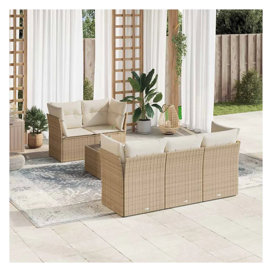 Cet ensemble de canapés de jardin est le complément parfait de votre arrière-cour, terrasse ou patio, offrant un espace confortable et accueillant pour discuter avec la famille et les amis ou simplement se détendre et profiter de l'extérieur. Matériau durable : la résine tressée, également connue sous le nom de poly rotin, est un matériau synthétique solide et nécessitant peu d'entretien qui ressemble au rotin naturel. Il est léger, facile à nettoyer et couramment utilisé pour les meubles d'extérieur en raison de sa durabilité et de ses propriétés de résistance aux intempéries.Expérience d'assise confortable : cet ensemble de meubles d'extérieur, doté de coussins épais, offre une expérience d'assise confortable.Housse amovible et lavable : ces coussins de siège sont dotés de housses amovibles pour un lavage et un entretien faciles.Dessus en verre : le dessus de la table d'extérieur est fabriqué en verre trempé solide et durable, ce qui le rend facile à nettoyer avec un chiffon humide et ajoute une touche d'élégance à votre espace extérieur.Conception modulaire : cet ensemble de meubles d'extérieur a une conception modulaire, ce qui le rend complètement flexible et facile à déplacer, afin que vous puissiez créer un agencement de meubles d'extérieur personnalisé. Bon à savoir :Pour que vos meubles d'extérieur restent beaux, nous vous recommandons de les protéger avec une housse imperméable.