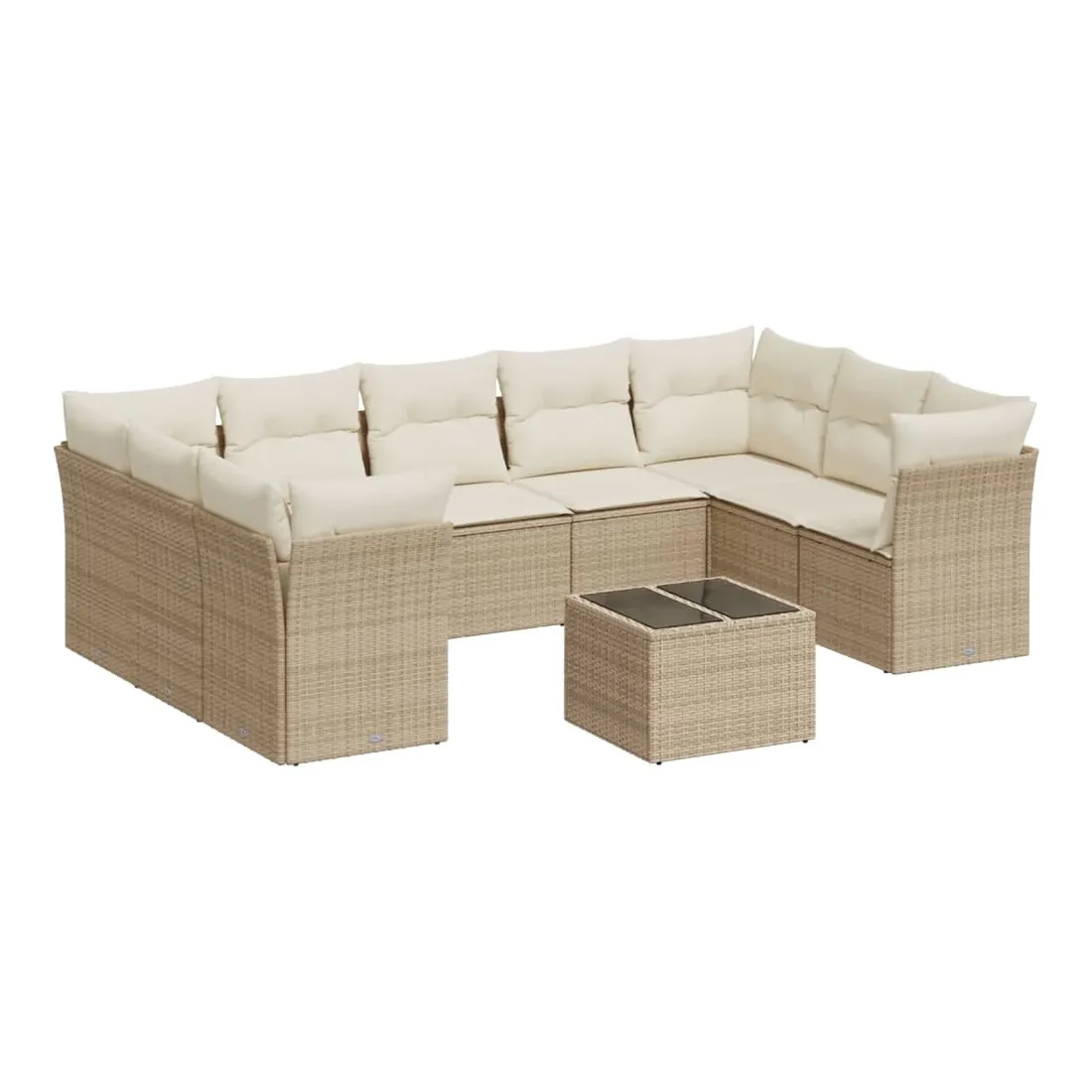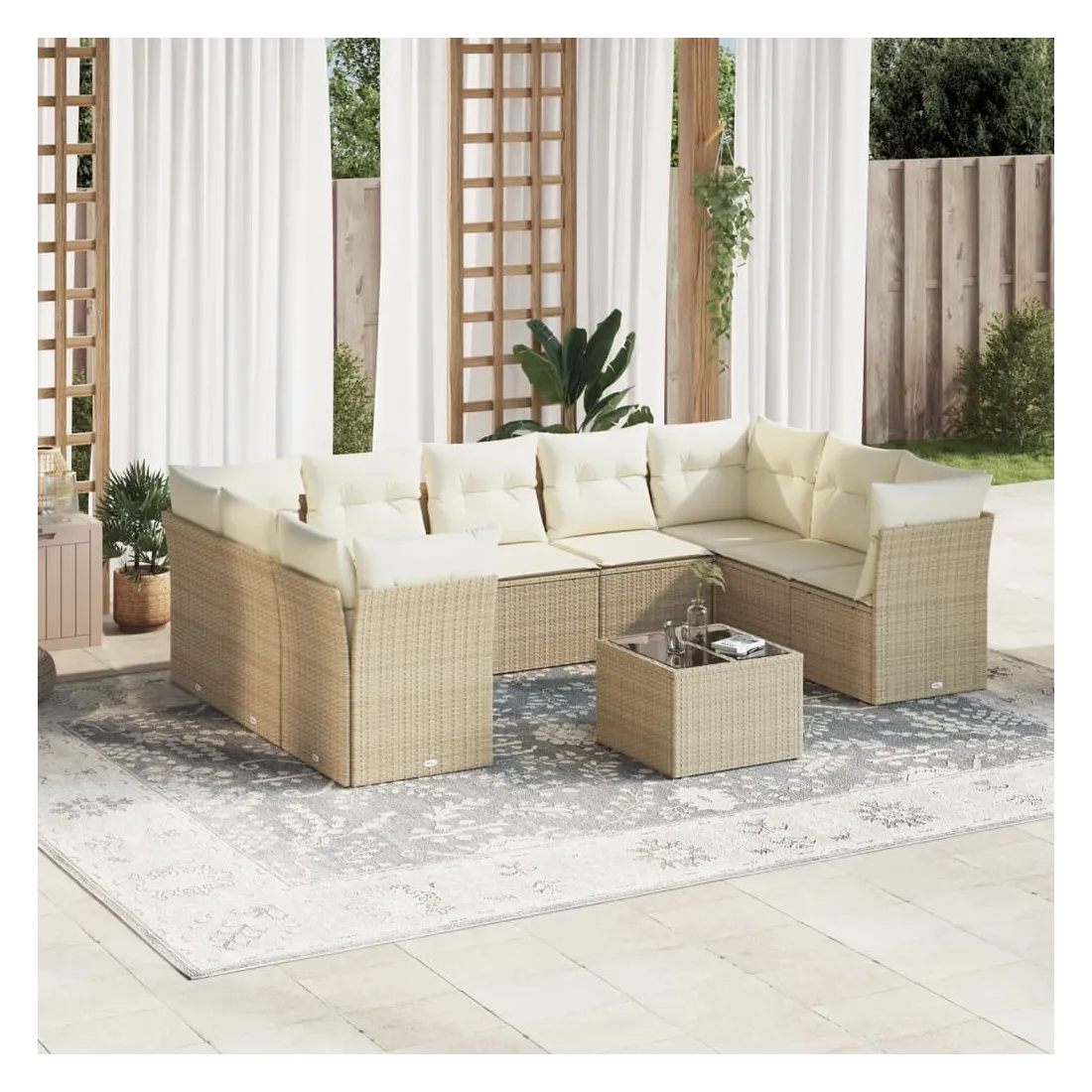 Cet ensemble de canapés de jardin est le complément parfait de votre arrière-cour, terrasse ou patio, offrant un espace confortable et accueillant pour discuter avec la famille et les amis ou simplement se détendre et profiter de l'extérieur. Matériau durable : la résine tressée, également connue sous le nom de poly rotin, est un matériau synthétique solide et nécessitant peu d'entretien qui ressemble au rotin naturel. Il est léger, facile à nettoyer et couramment utilisé pour les meubles d'extérieur en raison de sa durabilité et de ses propriétés de résistance aux intempéries.Expérience d'assise confortable : ce mobilier d'extérieur, doté de coussins épais, offre une expérience d'assise confortable.Dessus en verre : le dessus de la table d'extérieur est fabriqué en verre trempé solide et durable, ce qui le rend facile à nettoyer avec un chiffon humide et ajoute une touche d'élégance à votre espace extérieur.Housse amovible et lavable : ces coussins de siège sont dotés de housses amovibles pour un lavage et un entretien faciles.Conception modulaire : cet ensemble de meubles d'extérieur a une conception modulaire, ce qui le rend complètement flexible et facile à déplacer, afin que vous puissiez créer un agencement de meubles d'extérieur personnalisé. Bon à savoir :Pour que vos meubles d'extérieur restent beaux, nous vous recommandons de les protéger avec une housse imperméable.