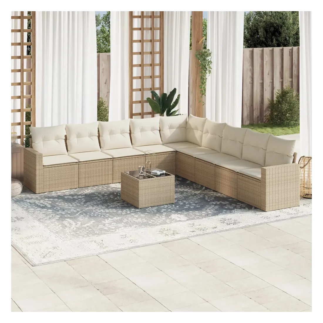 Cet ensemble de canapés de jardin est le complément parfait de votre arrière-cour, terrasse ou patio, offrant un espace confortable et accueillant pour discuter avec la famille et les amis ou simplement se détendre et profiter de l'extérieur. Matériau durable : la résine tressée, également connue sous le nom de poly rotin, est un matériau synthétique solide et nécessitant peu d'entretien qui ressemble au rotin naturel. Il est léger, facile à nettoyer et couramment utilisé pour les meubles d'extérieur en raison de sa durabilité et de ses propriétés de résistance aux intempéries.Expérience d'assise confortable : ce mobilier d'extérieur, doté de coussins épais, offre une expérience d'assise confortable. Les larges accoudoirs offrent également un endroit pratique pour garder votre téléphone portable, vos tasses ou d'autres petits objets à portée de main.Housse amovible et lavable : ces coussins de siège sont dotés de housses amovibles pour un lavage et un entretien faciles.Dessus en verre : le dessus de la table d'extérieur est fabriqué en verre trempé solide et durable, ce qui le rend facile à nettoyer avec un chiffon humide et ajoute une touche d'élégance à votre espace extérieur.Conception modulaire : cet ensemble de meubles d'extérieur a une conception modulaire, ce qui le rend complètement flexible et facile à déplacer, afin que vous puissiez créer un agencement de meubles d'extérieur personnalisé. Bon à savoir :Pour que vos meubles d'extérieur restent beaux, nous vous recommandons de les protéger avec une housse imperméable.