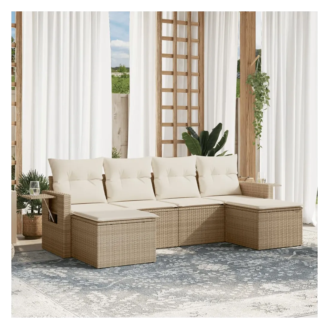Cet ensemble de canapés de jardin est le complément parfait de votre arrière-cour, terrasse ou patio, offrant un espace confortable et accueillant pour discuter avec la famille et les amis ou simplement se détendre et profiter de l'extérieur. Matériau durable : la résine tressée, également connue sous le nom de poly rotin, est un matériau synthétique solide et nécessitant peu d'entretien qui ressemble au rotin naturel. Il est léger, facile à nettoyer et couramment utilisé pour les meubles d'extérieur en raison de sa durabilité et de ses propriétés de résistance aux intempéries. Table d'appoint pratique : ce mobilier d'extérieur comprend des tables d'appoint pliables avec un ressort à gaz sur les accoudoirs, offrant des endroits pratiques pour garder vos essentiels à portée de main. Expérience d'assise confortable : ce mobilier d'extérieur, doté de coussins épais, offre une expérience d'assise confortable. Housse amovible et lavable : ces coussins de siège sont dotés de housses amovibles pour un lavage et un entretien faciles.Conception modulaire : cet ensemble de meubles d'extérieur a une conception modulaire, ce qui le rend complètement flexible et facile à déplacer, afin que vous puissiez créer un agencement de meubles d'extérieur personnalisé. Bon à savoir :Pour que vos meubles d'extérieur restent beaux, nous vous recommandons de les protéger avec une housse imperméable.
