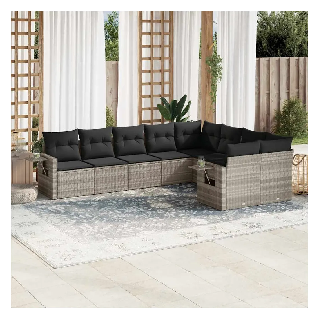 Cet ensemble de canapés de jardin est le complément parfait de votre arrière-cour, terrasse ou patio, offrant un espace confortable et accueillant pour discuter avec la famille et les amis ou simplement se détendre et profiter de l'extérieur. Matériau durable : la résine tressée, également connue sous le nom de poly rotin, est un matériau synthétique solide et nécessitant peu d'entretien qui ressemble au rotin naturel. Il est léger, facile à nettoyer et couramment utilisé pour les meubles d'extérieur en raison de sa durabilité et de ses propriétés de résistance aux intempéries. Table d'appoint pratique : ce mobilier d'extérieur comprend des tables d'appoint pliables avec un ressort à gaz sur les accoudoirs, offrant des endroits pratiques pour garder vos essentiels à portée de main. Expérience d'assise confortable : ce mobilier d'extérieur, doté de coussins épais, offre une expérience d'assise confortable.Housse amovible et lavable : ces coussins de siège sont dotés de housses amovibles pour un lavage et un entretien faciles.Conception modulaire : cet ensemble de meubles d'extérieur a une conception modulaire, ce qui le rend complètement flexible et facile à déplacer, afin que vous puissiez créer un agencement de meubles d'extérieur personnalisé. Bon à savoir :Pour que vos meubles d'extérieur restent beaux, nous vous recommandons de les protéger avec une housse imperméable.