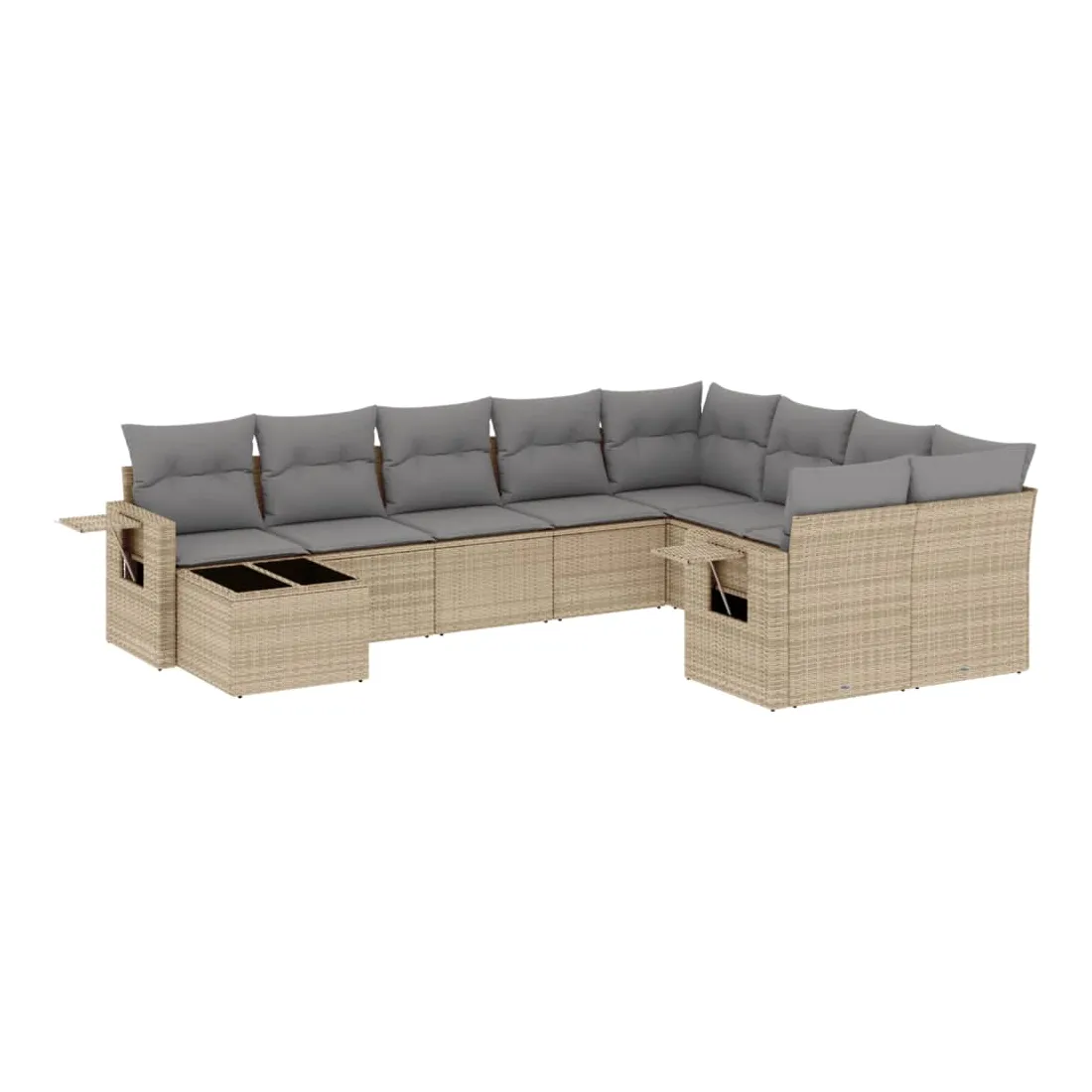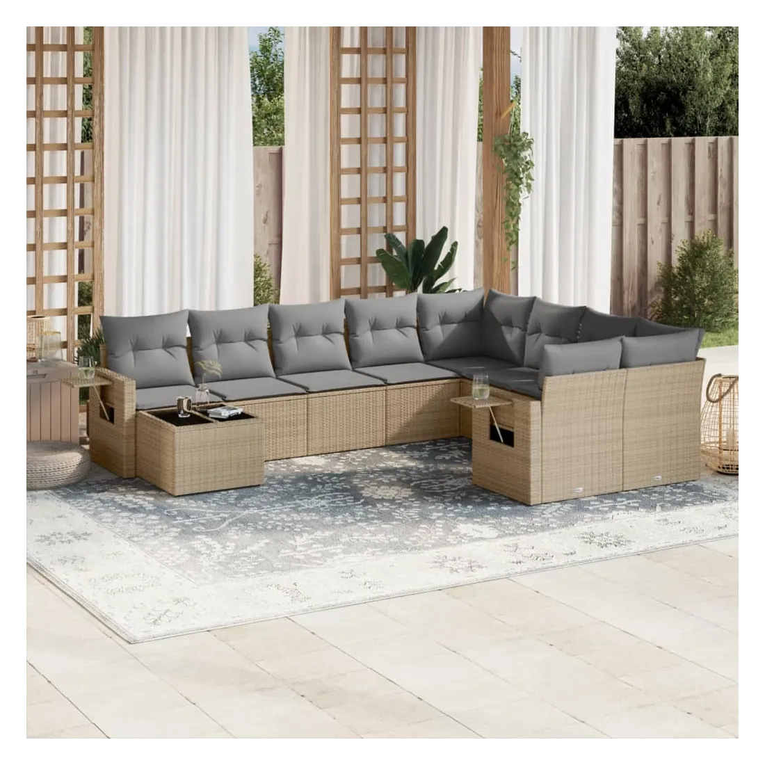 Cet ensemble de canapés de jardin est le complément parfait de votre arrière-cour, terrasse ou patio, offrant un espace confortable et accueillant pour discuter avec la famille et les amis ou simplement se détendre et profiter de l'extérieur. Matériau durable : la résine tressée, également connue sous le nom de poly rotin, est un matériau synthétique solide et nécessitant peu d'entretien qui ressemble au rotin naturel. Il est léger, facile à nettoyer et couramment utilisé pour les meubles d'extérieur en raison de sa durabilité et de ses propriétés de résistance aux intempéries.Dessus en verre : le dessus de la table d'extérieur est fabriqué en verre trempé solide et durable, ce qui le rend facile à nettoyer avec un chiffon humide et ajoute une touche d'élégance à votre espace extérieur. Table d'appoint pratique : ce mobilier d'extérieur comprend des tables d'appoint pliables avec un ressort à gaz sur les accoudoirs, offrant des endroits pratiques pour garder vos essentiels à portée de main. Expérience d'assise confortable : ce mobilier d'extérieur, doté de coussins épais, offre une expérience d'assise confortable.Conception modulaire : cet ensemble de meubles d'extérieur a une conception modulaire, ce qui le rend complètement flexible et facile à déplacer, afin que vous puissiez créer un agencement de meubles d'extérieur personnalisé. Bon à savoir :Pour que vos meubles d'extérieur restent beaux, nous vous recommandons de les protéger avec une housse imperméable.