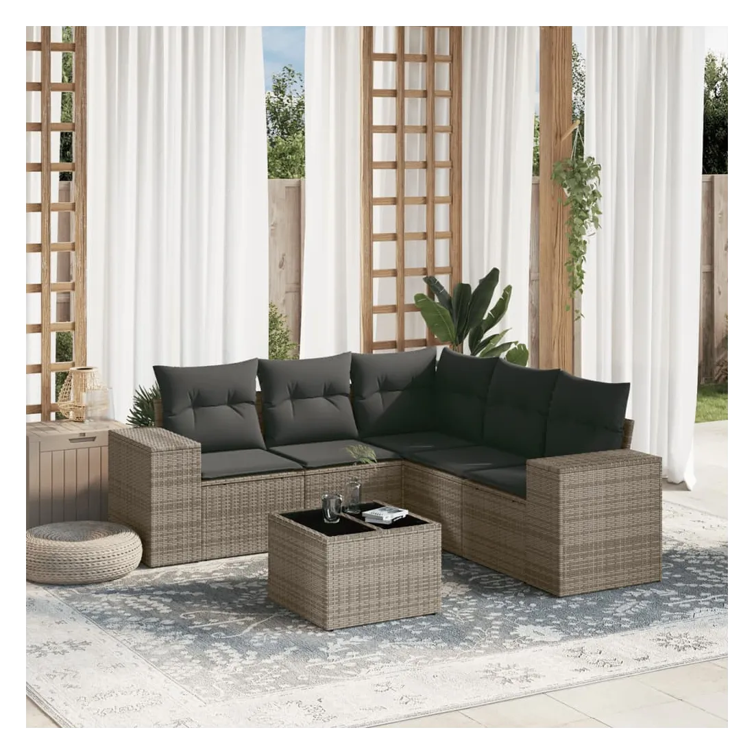 Cet ensemble de canapés de jardin est le complément parfait de votre arrière-cour, terrasse ou patio, offrant un espace confortable et accueillant pour discuter avec la famille et les amis ou simplement se détendre et profiter de l'extérieur. Matériau durable : la résine tressée, également connue sous le nom de poly rotin, est un matériau synthétique solide et nécessitant peu d'entretien qui ressemble au rotin naturel. Il est léger, facile à nettoyer et couramment utilisé pour les meubles d'extérieur en raison de sa durabilité et de ses propriétés de résistance aux intempéries.Expérience d'assise confortable : ce mobilier d'extérieur, doté de coussins épais, offre une expérience d'assise confortable.Dessus en verre : le dessus de la table d'extérieur est fabriqué en verre trempé solide et durable, ce qui le rend facile à nettoyer avec un chiffon humide et ajoute une touche d'élégance à votre espace extérieur.Housse amovible et lavable : ces coussins de siège sont dotés de housses amovibles pour un lavage et un entretien faciles.Conception modulaire : cet ensemble de meubles d'extérieur a une conception modulaire, ce qui le rend complètement flexible et facile à déplacer, afin que vous puissiez créer un agencement de meubles d'extérieur personnalisé. Bon à savoir :Pour que vos meubles d'extérieur restent beaux, nous vous recommandons de les protéger avec une housse imperméable.