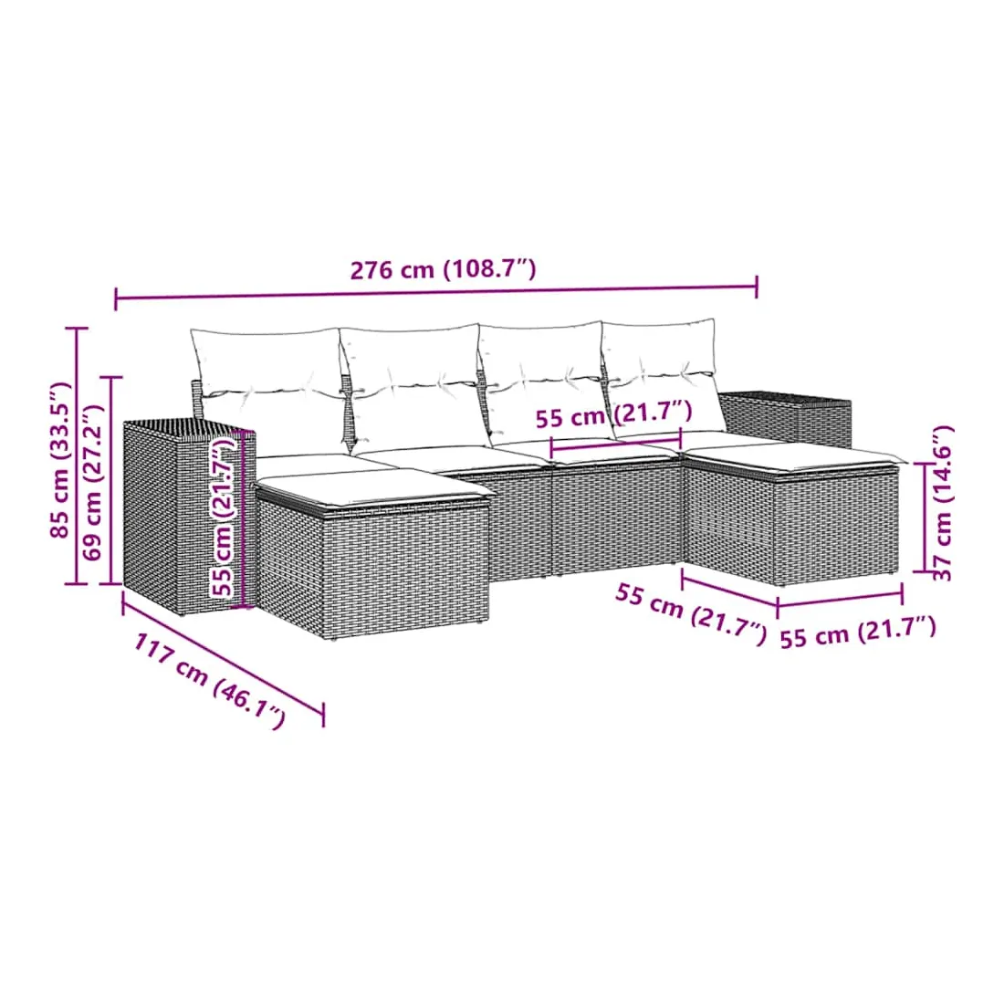 Cet ensemble de canapés de jardin est le complément parfait de votre arrière-cour, terrasse ou patio, offrant un espace confortable et accueillant pour discuter avec la famille et les amis ou simplement se détendre et profiter de l'extérieur. Matériau durable : la résine tressée, également connue sous le nom de poly rotin, est un matériau synthétique solide et nécessitant peu d'entretien qui ressemble au rotin naturel. Il est léger, facile à nettoyer et couramment utilisé pour les meubles d'extérieur en raison de sa durabilité et de ses propriétés de résistance aux intempéries.Expérience d'assise confortable : ce mobilier d'extérieur, doté de coussins épais, offre une expérience d'assise confortable.Housse amovible et lavable : ces coussins de siège sont dotés de housses amovibles pour un lavage et un entretien faciles.Conception modulaire : cet ensemble de meubles d'extérieur a une conception modulaire, ce qui le rend complètement flexible et facile à déplacer, afin que vous puissiez créer un agencement de meubles d'extérieur personnalisé. Bon à savoir :Pour que vos meubles d'extérieur restent beaux, nous vous recommandons de les protéger avec une housse imperméable.