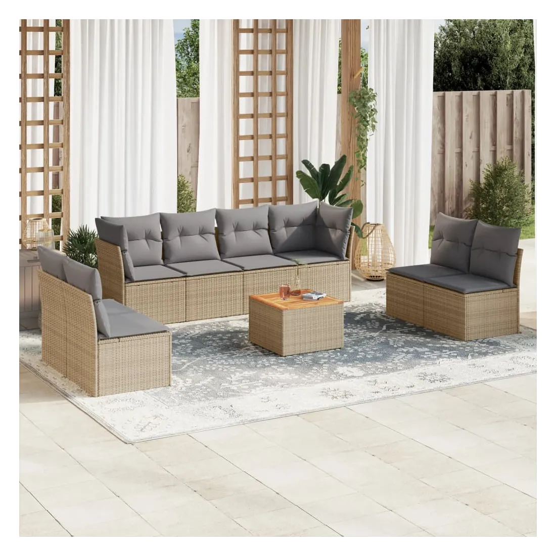 Cet ensemble de canapés de jardin est le complément parfait de votre arrière-cour, terrasse ou patio, offrant un espace confortable et accueillant pour discuter avec la famille et les amis ou simplement se détendre et profiter de l'extérieur. Matériau durable : la résine tressée, également connue sous le nom de poly rotin, est un matériau synthétique solide et nécessitant peu d'entretien qui ressemble au rotin naturel. Il est léger, facile à nettoyer et couramment utilisé pour les meubles d'extérieur en raison de sa durabilité et de ses propriétés de résistance aux intempéries.Expérience d'assise confortable : ce mobilier d'extérieur, doté de coussins épais, offre une expérience d'assise confortable.Dessus stable et facile à nettoyer : cette table de jardin a un dessus en bois d'acacia robuste, durable et facile à nettoyer avec un chiffon humide.Housse amovible et lavable : ces coussins de siège sont dotés de housses amovibles pour un lavage et un entretien faciles.Conception modulaire : cet ensemble de meubles d'extérieur a une conception modulaire, ce qui le rend complètement flexible et facile à déplacer, afin que vous puissiez créer un agencement de meubles d'extérieur personnalisé. Bon à savoir :Pour que vos meubles d'extérieur restent beaux, nous vous recommandons de les protéger avec une housse imperméable.