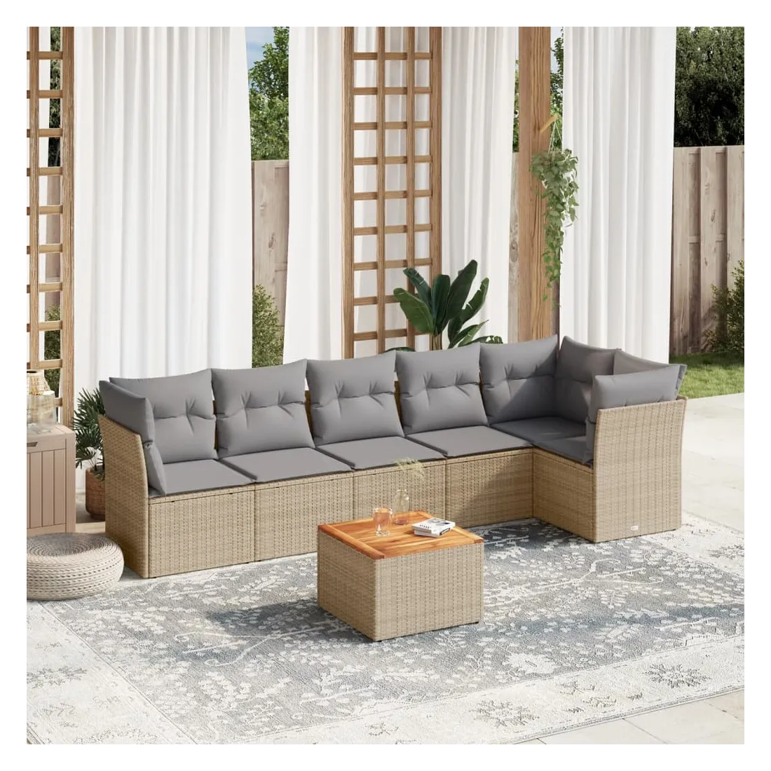Cet ensemble de canapés de jardin est le complément parfait de votre arrière-cour, terrasse ou patio, offrant un espace confortable et accueillant pour discuter avec la famille et les amis ou simplement se détendre et profiter de l'extérieur. Matériau durable : la résine tressée, également connue sous le nom de poly rotin, est un matériau synthétique solide et nécessitant peu d'entretien qui ressemble au rotin naturel. Il est léger, facile à nettoyer et couramment utilisé pour les meubles d'extérieur en raison de sa durabilité et de ses propriétés de résistance aux intempéries.Expérience d'assise confortable : ce mobilier d'extérieur, doté de coussins épais, offre une expérience d'assise confortable.Dessus stable et facile à nettoyer : cette table de jardin a un dessus en bois d'acacia robuste, durable et facile à nettoyer avec un chiffon humide.Housse amovible et lavable : ces coussins de siège sont dotés de housses amovibles pour un lavage et un entretien faciles.Conception modulaire : cet ensemble de meubles d'extérieur a une conception modulaire, ce qui le rend complètement flexible et facile à déplacer, afin que vous puissiez créer un agencement de meubles d'extérieur personnalisé. Bon à savoir :Pour que vos meubles d'extérieur restent beaux, nous vous recommandons de les protéger avec une housse imperméable.