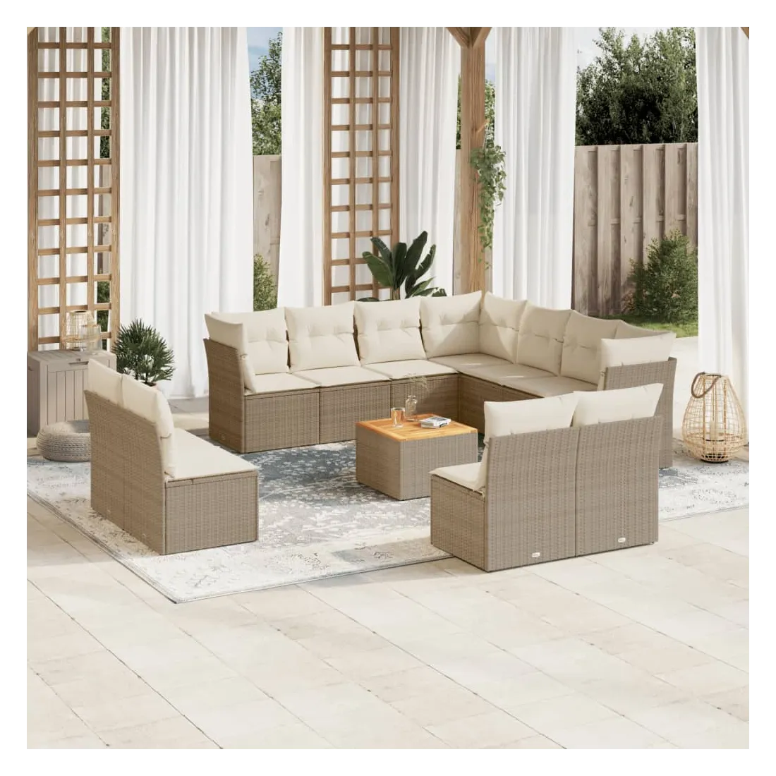 Cet ensemble de canapés de jardin est le complément parfait de votre arrière-cour, terrasse ou patio, offrant un espace confortable et accueillant pour discuter avec la famille et les amis ou simplement se détendre et profiter de l'extérieur. Matériau durable : la résine tressée, également connue sous le nom de poly rotin, est un matériau synthétique solide et nécessitant peu d'entretien qui ressemble au rotin naturel. Il est léger, facile à nettoyer et couramment utilisé pour les meubles d'extérieur en raison de sa durabilité et de ses propriétés de résistance aux intempéries.Expérience d'assise confortable : ce mobilier d'extérieur, doté de coussins épais, offre une expérience d'assise confortable.Dessus stable et facile à nettoyer : cette table de jardin a un dessus en bois d'acacia robuste, durable et facile à nettoyer avec un chiffon humide.Housse amovible et lavable : ces coussins de siège sont dotés de housses amovibles pour un lavage et un entretien faciles.Conception modulaire : cet ensemble de meubles d'extérieur a une conception modulaire, ce qui le rend complètement flexible et facile à déplacer, afin que vous puissiez créer un agencement de meubles d'extérieur personnalisé. Bon à savoir :Pour que vos meubles d'extérieur restent beaux, nous vous recommandons de les protéger avec une housse imperméable.