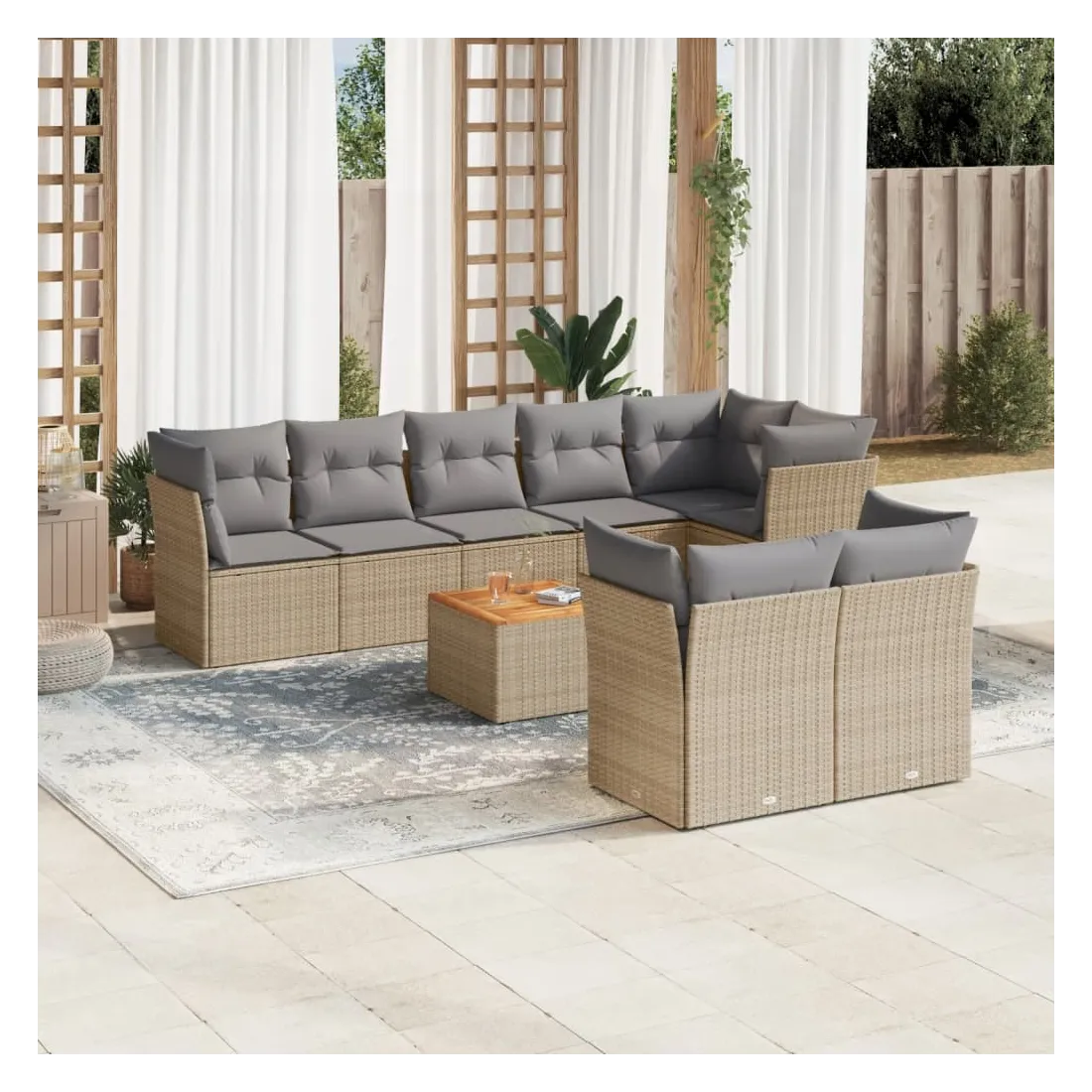 Cet ensemble de canapés de jardin est le complément parfait de votre arrière-cour, terrasse ou patio, offrant un espace confortable et accueillant pour discuter avec la famille et les amis ou simplement se détendre et profiter de l'extérieur. Matériau durable : la résine tressée, également connue sous le nom de poly rotin, est un matériau synthétique solide et nécessitant peu d'entretien qui ressemble au rotin naturel. Il est léger, facile à nettoyer et couramment utilisé pour les meubles d'extérieur en raison de sa durabilité et de ses propriétés de résistance aux intempéries.Expérience d'assise confortable : ce mobilier d'extérieur, doté de coussins épais, offre une expérience d'assise confortable.Dessus stable et facile à nettoyer : cette table de jardin a un dessus en bois d'acacia robuste, durable et facile à nettoyer avec un chiffon humide.Housse amovible et lavable : ces coussins de siège sont dotés de housses amovibles pour un lavage et un entretien faciles.Conception modulaire : cet ensemble de meubles d'extérieur a une conception modulaire, ce qui le rend complètement flexible et facile à déplacer, afin que vous puissiez créer un agencement de meubles d'extérieur personnalisé. Bon à savoir :Pour que vos meubles d'extérieur restent beaux, nous vous recommandons de les protéger avec une housse imperméable.