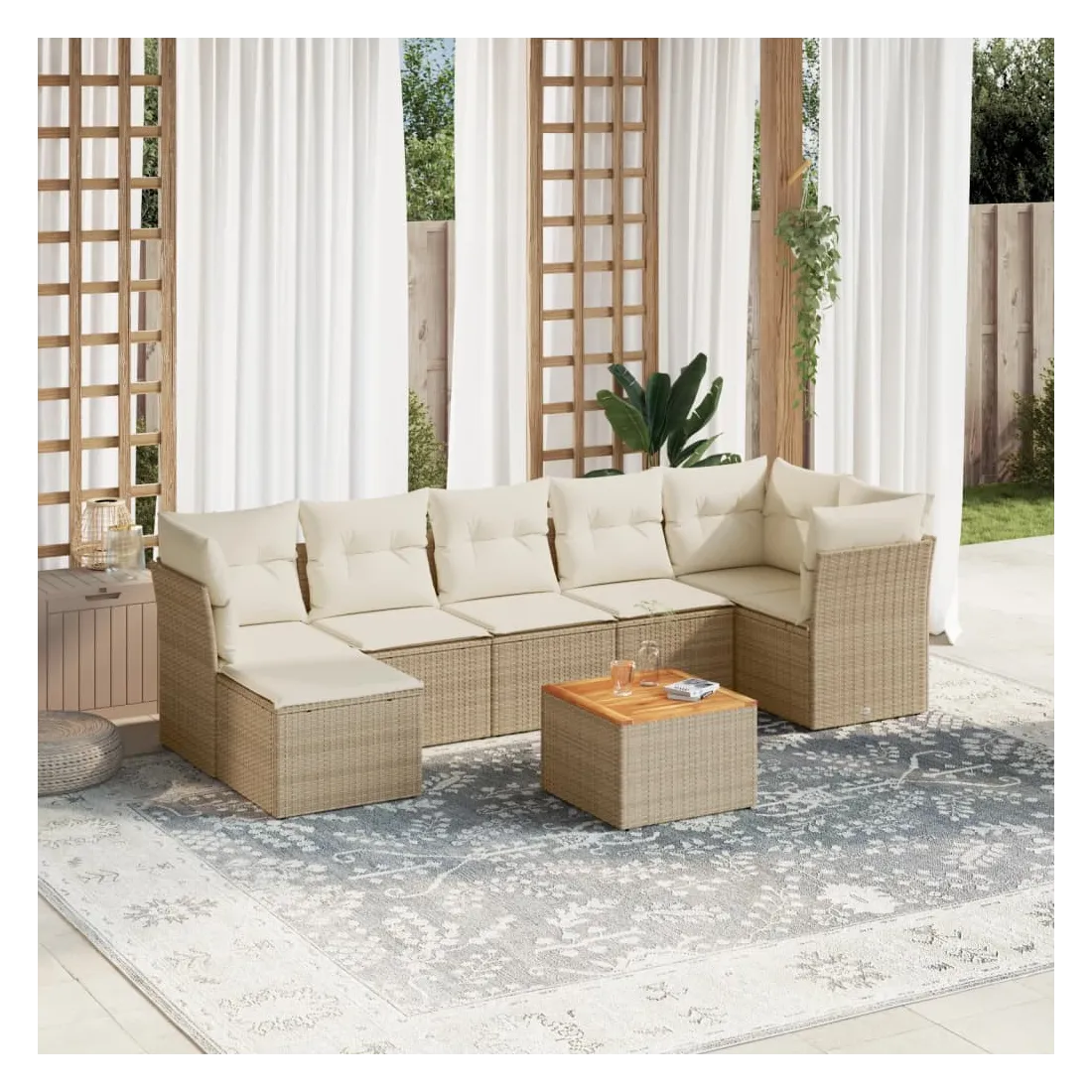 Cet ensemble de canapés de jardin est le complément parfait de votre arrière-cour, terrasse ou patio, offrant un espace confortable et accueillant pour discuter avec la famille et les amis ou simplement se détendre et profiter de l'extérieur. Matériau durable : la résine tressée, également connue sous le nom de poly rotin, est un matériau synthétique solide et nécessitant peu d'entretien qui ressemble au rotin naturel. Il est léger, facile à nettoyer et couramment utilisé pour les meubles d'extérieur en raison de sa durabilité et de ses propriétés de résistance aux intempéries.Expérience d'assise confortable : ce mobilier d'extérieur, doté de coussins épais, offre une expérience d'assise confortable.Dessus stable et facile à nettoyer : cette table de jardin a un dessus en bois d'acacia robuste, durable et facile à nettoyer avec un chiffon humide.Housse amovible et lavable : ces coussins de siège sont dotés de housses amovibles pour un lavage et un entretien faciles.Conception modulaire : cet ensemble de meubles d'extérieur a une conception modulaire, ce qui le rend complètement flexible et facile à déplacer, afin que vous puissiez créer un agencement de meubles d'extérieur personnalisé. Bon à savoir :Pour que vos meubles d'extérieur restent beaux, nous vous recommandons de les protéger avec une housse imperméable.