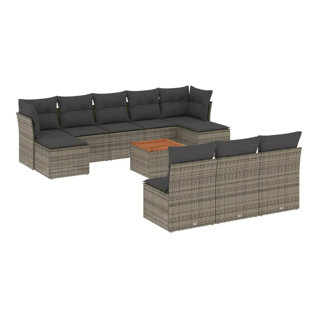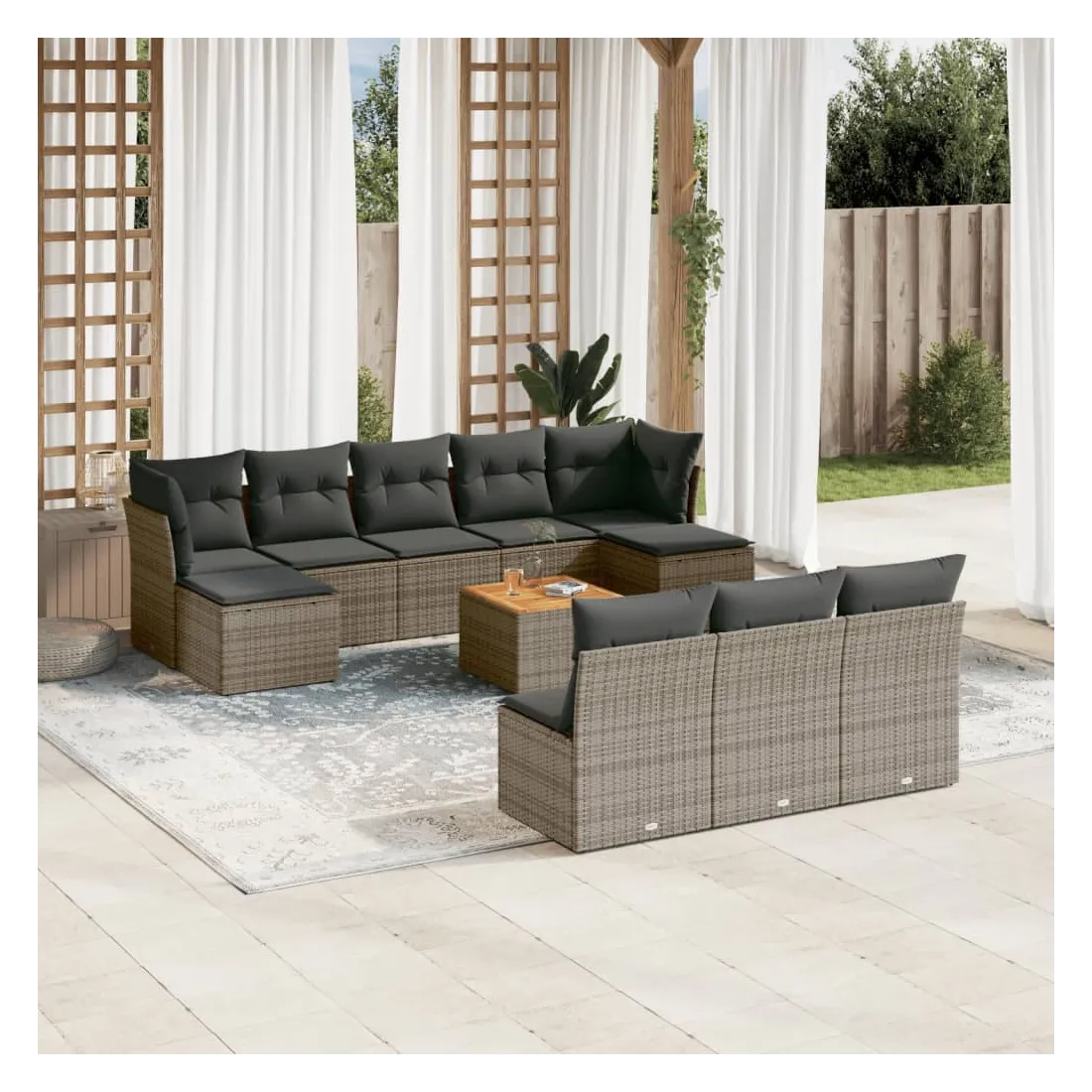 Cet ensemble de canapés de jardin est le complément parfait de votre arrière-cour, terrasse ou patio, offrant un espace confortable et accueillant pour discuter avec la famille et les amis ou simplement se détendre et profiter de l'extérieur. Matériau durable : la résine tressée, également connue sous le nom de poly rotin, est un matériau synthétique solide et nécessitant peu d'entretien qui ressemble au rotin naturel. Il est léger, facile à nettoyer et couramment utilisé pour les meubles d'extérieur en raison de sa durabilité et de ses propriétés de résistance aux intempéries.Expérience d'assise confortable : ce mobilier d'extérieur, doté de coussins épais, offre une expérience d'assise confortable.Dessus stable et facile à nettoyer : cette table de jardin a un dessus en bois d'acacia robuste, durable et facile à nettoyer avec un chiffon humide.Housse amovible et lavable : ces coussins de siège sont dotés de housses amovibles pour un lavage et un entretien faciles.Conception modulaire : cet ensemble de meubles d'extérieur a une conception modulaire, ce qui le rend complètement flexible et facile à déplacer, afin que vous puissiez créer un agencement de meubles d'extérieur personnalisé. Bon à savoir :Pour que vos meubles d'extérieur restent beaux, nous vous recommandons de les protéger avec une housse imperméable.