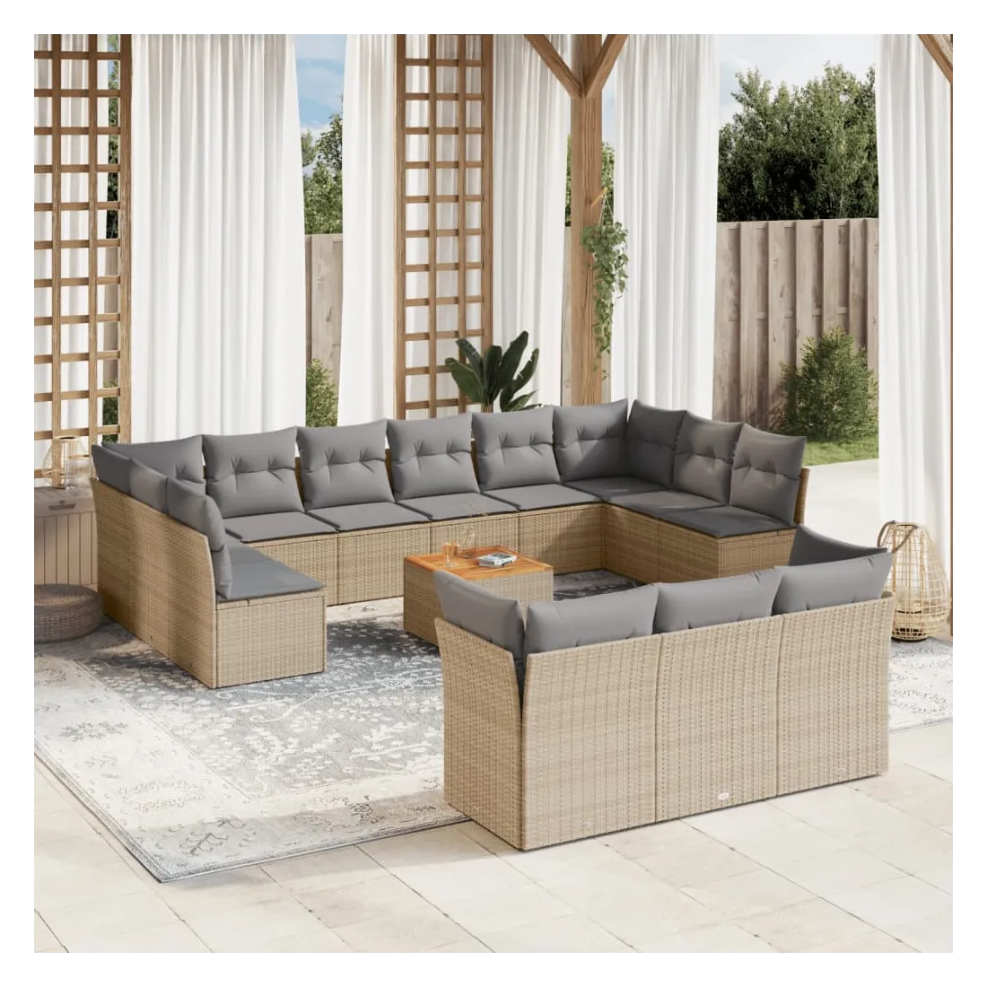 Cet ensemble de canapés de jardin est le complément parfait de votre arrière-cour, terrasse ou patio, offrant un espace confortable et accueillant pour discuter avec la famille et les amis ou simplement se détendre et profiter de l'extérieur. Matériau durable : la résine tressée, également connue sous le nom de poly rotin, est un matériau synthétique solide et nécessitant peu d'entretien qui ressemble au rotin naturel. Il est léger, facile à nettoyer et couramment utilisé pour les meubles d'extérieur en raison de sa durabilité et de ses propriétés de résistance aux intempéries.Expérience d'assise confortable : ce mobilier d'extérieur, doté de coussins épais, offre une expérience d'assise confortable.Dessus stable et facile à nettoyer : cette table de jardin a un dessus en bois d'acacia robuste, durable et facile à nettoyer avec un chiffon humide.Housse amovible et lavable : ces coussins de siège sont dotés de housses amovibles pour un lavage et un entretien faciles.Conception modulaire : cet ensemble de meubles d'extérieur a une conception modulaire, ce qui le rend complètement flexible et facile à déplacer, afin que vous puissiez créer un agencement de meubles d'extérieur personnalisé. Bon à savoir :Pour que vos meubles d'extérieur restent beaux, nous vous recommandons de les protéger avec une housse imperméable.