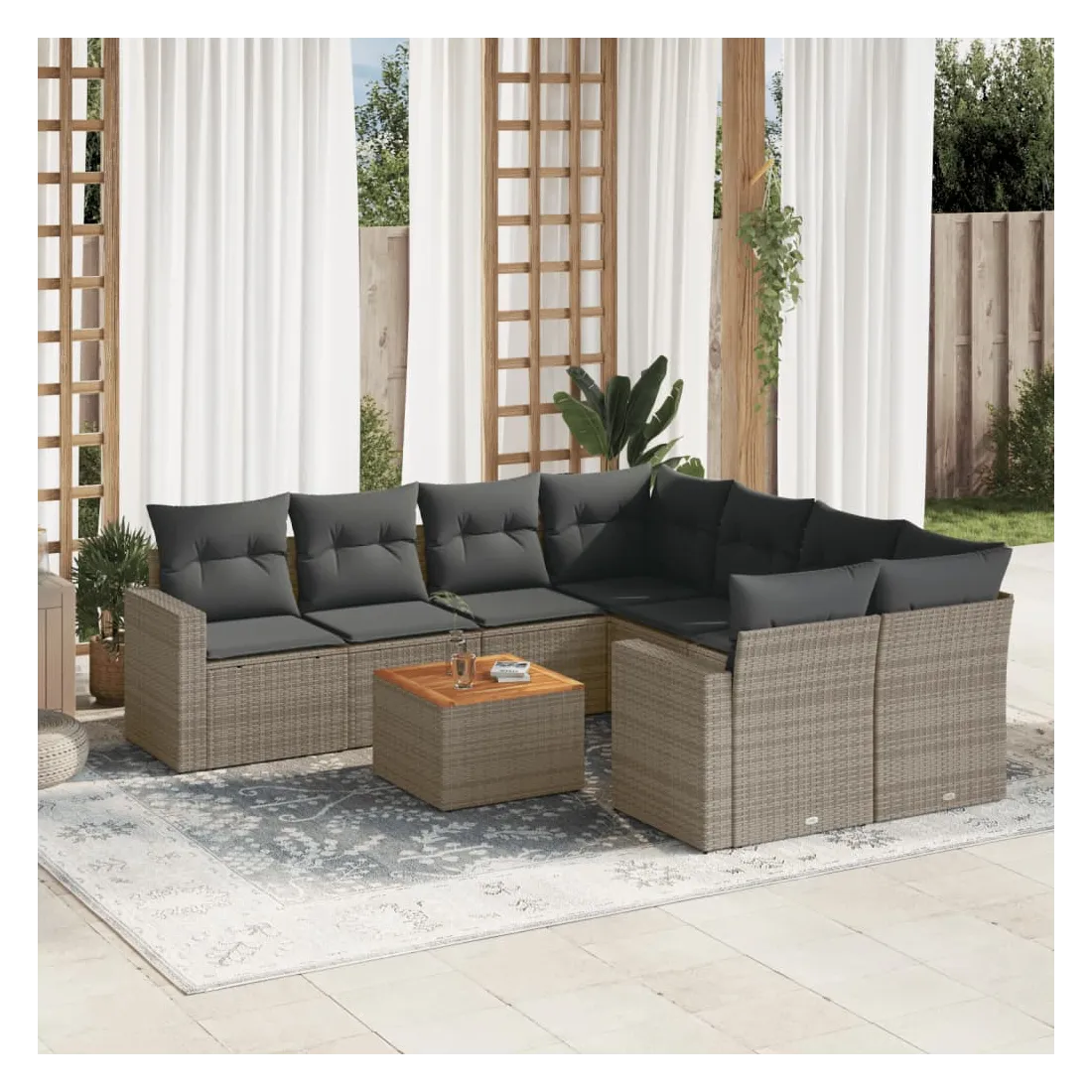 Cet ensemble de canapés de jardin est le complément parfait de votre arrière-cour, terrasse ou patio, offrant un espace confortable et accueillant pour discuter avec la famille et les amis ou simplement se détendre et profiter de l'extérieur. Matériau durable : la résine tressée, également connue sous le nom de poly rotin, est un matériau synthétique solide et nécessitant peu d'entretien qui ressemble au rotin naturel. Il est léger, facile à nettoyer et couramment utilisé pour les meubles d'extérieur en raison de sa durabilité et de ses propriétés de résistance aux intempéries.Expérience d'assise confortable : ce mobilier d'extérieur, doté de coussins épais, offre une expérience d'assise confortable.Dessus stable et facile à nettoyer : cette table de jardin a un dessus en bois d'acacia robuste, durable et facile à nettoyer avec un chiffon humide.Housse amovible et lavable : ces coussins de siège sont dotés de housses amovibles pour un lavage et un entretien faciles.Conception modulaire : cet ensemble de meubles d'extérieur a une conception modulaire, ce qui le rend complètement flexible et facile à déplacer, afin que vous puissiez créer un agencement de meubles d'extérieur personnalisé. Bon à savoir :Pour que vos meubles d'extérieur restent beaux, nous vous recommandons de les protéger avec une housse imperméable.