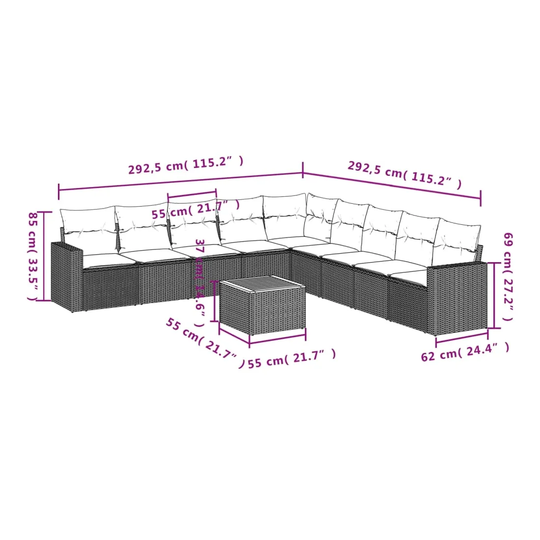 - Dimensions du coussin de siège : 55 x 55 x 3 cm (l x P x é)
