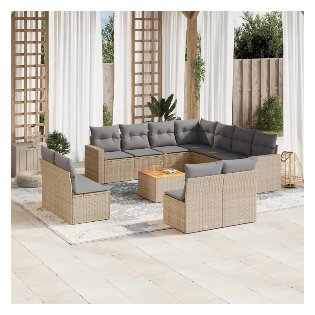 Cet ensemble de canapés de jardin est le complément parfait de votre arrière-cour, terrasse ou patio, offrant un espace confortable et accueillant pour discuter avec la famille et les amis ou simplement se détendre et profiter de l'extérieur. Matériau durable : la résine tressée, également connue sous le nom de poly rotin, est un matériau synthétique solide et nécessitant peu d'entretien qui ressemble au rotin naturel. Il est léger, facile à nettoyer et couramment utilisé pour les meubles d'extérieur en raison de sa durabilité et de ses propriétés de résistance aux intempéries.Expérience d'assise confortable : ce mobilier d'extérieur, doté de coussins épais, offre une expérience d'assise confortable.Dessus stable et facile à nettoyer : cette table de jardin a un dessus en bois d'acacia robuste, durable et facile à nettoyer avec un chiffon humide.Housse amovible et lavable : ces coussins de siège sont dotés de housses amovibles pour un lavage et un entretien faciles.Conception modulaire : cet ensemble de meubles d'extérieur a une conception modulaire, ce qui le rend complètement flexible et facile à déplacer, afin que vous puissiez créer un agencement de meubles d'extérieur personnalisé. Bon à savoir :Pour que vos meubles d'extérieur restent beaux, nous vous recommandons de les protéger avec une housse imperméable.