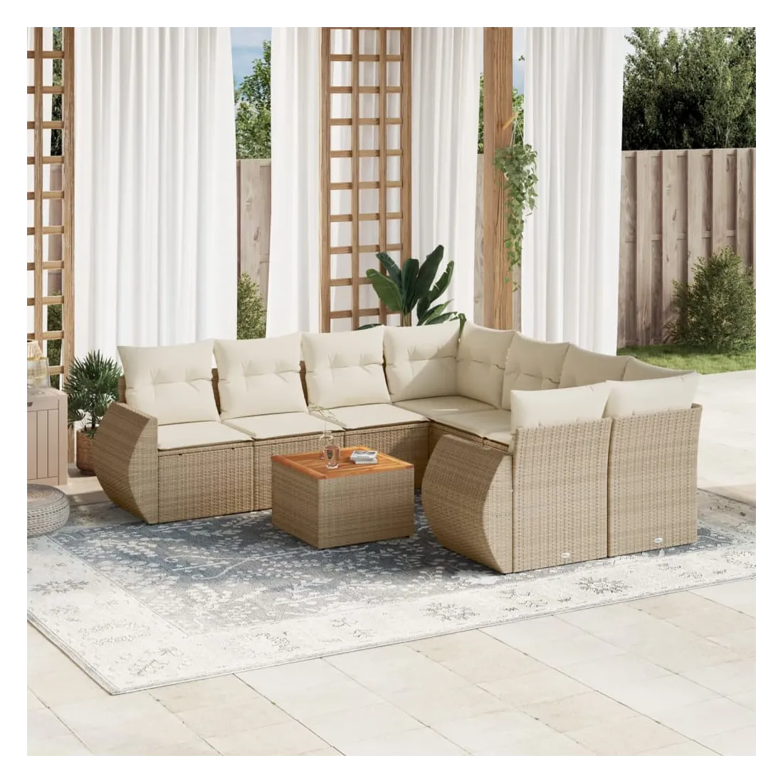 Cet ensemble de canapés de jardin est le complément parfait de votre arrière-cour, terrasse ou patio, offrant un espace confortable et accueillant pour discuter avec la famille et les amis ou simplement se détendre et profiter de l'extérieur. Matériau durable : la résine tressée, également connue sous le nom de poly rotin, est un matériau synthétique solide et nécessitant peu d'entretien qui ressemble au rotin naturel. Il est léger, facile à nettoyer et couramment utilisé pour les meubles d'extérieur en raison de sa durabilité et de ses propriétés de résistance aux intempéries.Dessus stable et facile à nettoyer : cette table de jardin a un dessus en bois d'acacia robuste, durable et facile à nettoyer avec un chiffon humide. Expérience d'assise confortable : ce mobilier d'extérieur, doté de coussins épais, offre une expérience d'assise confortable.Housse amovible et lavable : ces coussins de siège sont dotés de housses amovibles pour un lavage et un entretien faciles.Conception modulaire : cet ensemble de meubles d'extérieur a une conception modulaire, ce qui le rend complètement flexible et facile à déplacer, afin que vous puissiez créer un agencement de meubles d'extérieur personnalisé. Bon à savoir :Pour que vos meubles d'extérieur restent beaux, nous vous recommandons de les protéger avec une housse imperméable.