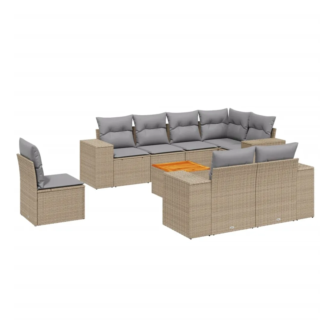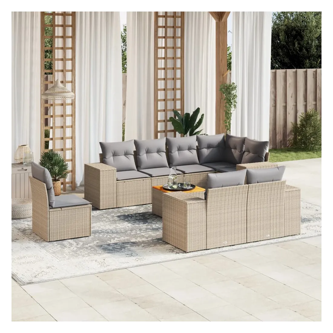 Cet ensemble de canapés de jardin est le complément parfait de votre arrière-cour, terrasse ou patio, offrant un espace confortable et accueillant pour discuter avec la famille et les amis ou simplement se détendre et profiter de l'extérieur. Matériau durable : la résine tressée, également connue sous le nom de poly rotin, est un matériau synthétique solide et nécessitant peu d'entretien qui ressemble au rotin naturel. Il est léger, facile à nettoyer et couramment utilisé pour les meubles d'extérieur en raison de sa durabilité et de ses propriétés de résistance aux intempéries.Dessus stable et facile à nettoyer : cette table de jardin a un dessus en bois d'acacia robuste, durable et facile à nettoyer avec un chiffon humide. Expérience d'assise confortable : ce mobilier d'extérieur, doté de coussins épais, offre une expérience d'assise confortable.Housse amovible et lavable : ces coussins de siège sont dotés de housses amovibles pour un lavage et un entretien faciles.Conception modulaire : cet ensemble de meubles d'extérieur a une conception modulaire, ce qui le rend complètement flexible et facile à déplacer, afin que vous puissiez créer un agencement de meubles d'extérieur personnalisé. Bon à savoir :Pour que vos meubles d'extérieur restent beaux, nous vous recommandons de les protéger avec une housse imperméable.