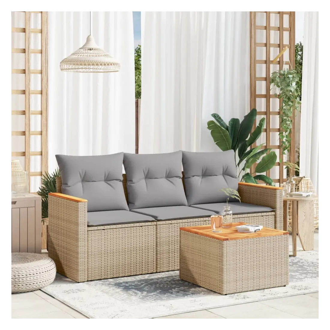 Cet ensemble de canapés de jardin est le complément parfait de votre arrière-cour, terrasse ou patio, offrant un espace confortable et accueillant pour discuter avec la famille et les amis ou simplement se détendre et profiter de l'extérieur. Matériau durable : la résine tressée, également connue sous le nom de poly rotin, est un matériau synthétique solide et nécessitant peu d'entretien qui ressemble au rotin naturel. Il est léger, facile à nettoyer et couramment utilisé pour les meubles d'extérieur en raison de sa durabilité et de ses propriétés de résistance aux intempéries.Dessus stable et facile à nettoyer : cette table de jardin a un dessus en bois d'acacia robuste, durable et facile à nettoyer avec un chiffon humide.Housse amovible et lavable : ces coussins de siège sont dotés de housses amovibles pour un lavage et un entretien faciles.Cadre robuste et stable : le cadre en acier enduit de poudre assure la solidité et la stabilité du meuble de jardin pour une utilisation quotidienne à l'extérieur.Conception modulaire : cet ensemble de meubles d'extérieur a une conception modulaire, ce qui le rend complètement flexible et facile à déplacer, afin que vous puissiez créer un agencement de meubles d'extérieur personnalisé. Bon à savoir :Pour que vos meubles d'extérieur restent beaux, nous vous recommandons de les protéger avec une housse imperméable.