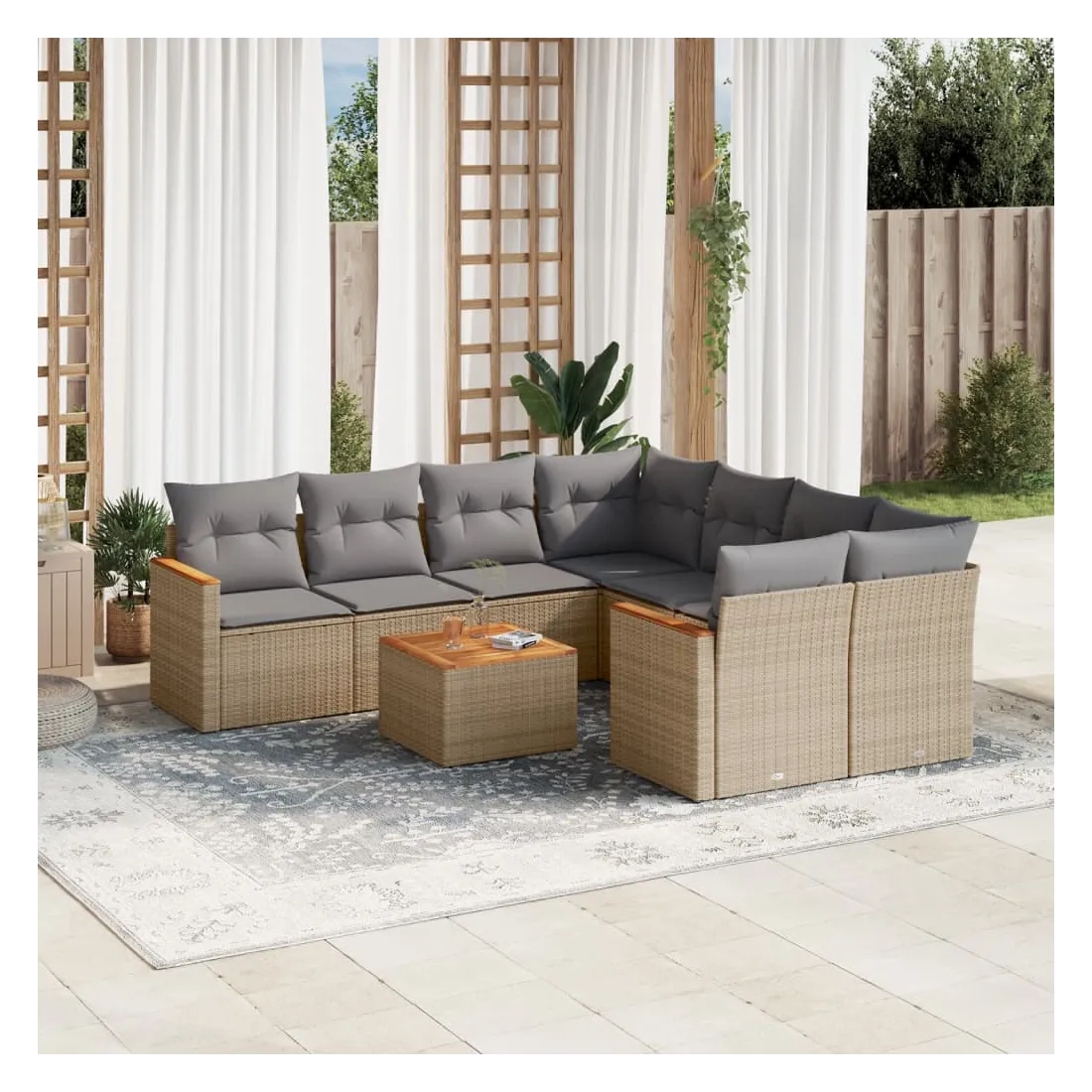 Cet ensemble de canapés de jardin est le complément parfait de votre arrière-cour, terrasse ou patio, offrant un espace confortable et accueillant pour discuter avec la famille et les amis ou simplement se détendre et profiter de l'extérieur. Matériau durable : la résine tressée, également connue sous le nom de poly rotin, est un matériau synthétique solide et nécessitant peu d'entretien qui ressemble au rotin naturel. Il est léger, facile à nettoyer et couramment utilisé pour les meubles d'extérieur en raison de sa durabilité et de ses propriétés de résistance aux intempéries.Dessus stable et facile à nettoyer : cette table de jardin a un dessus en bois d'acacia robuste, durable et facile à nettoyer avec un chiffon humide.Housse amovible et lavable : ces coussins de siège sont dotés de housses amovibles pour un lavage et un entretien faciles.Cadre robuste et stable : le cadre en acier enduit de poudre assure la solidité et la stabilité du meuble de jardin pour une utilisation quotidienne à l'extérieur.Conception modulaire : cet ensemble de meubles d'extérieur a une conception modulaire, ce qui le rend complètement flexible et facile à déplacer, afin que vous puissiez créer un agencement de meubles d'extérieur personnalisé. Bon à savoir :Pour que vos meubles d'extérieur restent beaux, nous vous recommandons de les protéger avec une housse imperméable.