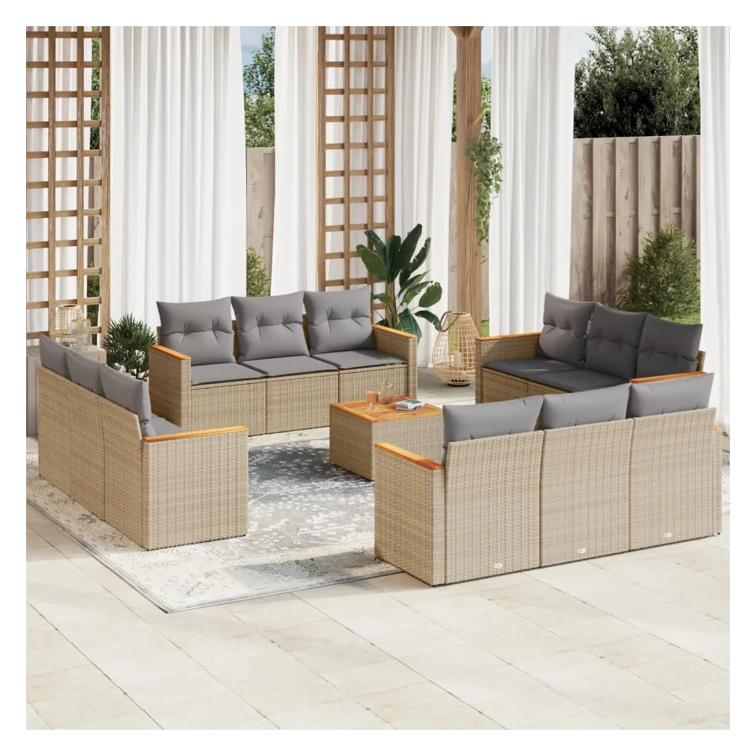 Cet ensemble de canapés de jardin est le complément parfait de votre arrière-cour, terrasse ou patio, offrant un espace confortable et accueillant pour discuter avec la famille et les amis ou simplement se détendre et profiter de l'extérieur. Matériau durable : la résine tressée, également connue sous le nom de poly rotin, est un matériau synthétique solide et nécessitant peu d'entretien qui ressemble au rotin naturel. Il est léger, facile à nettoyer et couramment utilisé pour les meubles d'extérieur en raison de sa durabilité et de ses propriétés de résistance aux intempéries.Dessus stable et facile à nettoyer : cette table de jardin a un dessus en bois d'acacia robuste, durable et facile à nettoyer avec un chiffon humide.Housse amovible et lavable : ces coussins de siège sont dotés de housses amovibles pour un lavage et un entretien faciles.Cadre robuste et stable : le cadre en acier enduit de poudre assure la solidité et la stabilité du meuble de jardin pour une utilisation quotidienne à l'extérieur.Conception modulaire : cet ensemble de meubles d'extérieur a une conception modulaire, ce qui le rend complètement flexible et facile à déplacer, afin que vous puissiez créer un agencement de meubles d'extérieur personnalisé. Bon à savoir :Pour que vos meubles d'extérieur restent beaux, nous vous recommandons de les protéger avec une housse imperméable.