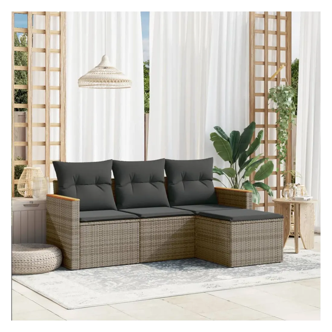 Cet ensemble de canapés de jardin est le complément parfait de votre arrière-cour, terrasse ou patio, offrant un espace confortable et accueillant pour discuter avec la famille et les amis ou simplement se détendre et profiter de l'extérieur. Matériau durable : la résine tressée, également connue sous le nom de poly rotin, est un matériau synthétique solide et nécessitant peu d'entretien qui ressemble au rotin naturel. Il est léger, facile à nettoyer et couramment utilisé pour les meubles d'extérieur en raison de sa durabilité et de ses propriétés de résistance aux intempéries.Housse amovible et lavable : ces coussins de siège sont dotés de housses amovibles pour un lavage et un entretien faciles.Cadre robuste et stable : le cadre en acier enduit de poudre assure la solidité et la stabilité du meuble de jardin pour une utilisation quotidienne à l'extérieur.Conception modulaire : cet ensemble de meubles d'extérieur a une conception modulaire, ce qui le rend complètement flexible et facile à déplacer, afin que vous puissiez créer un agencement de meubles d'extérieur personnalisé. Bon à savoir :Pour que vos meubles d'extérieur restent beaux, nous vous recommandons de les protéger avec une housse imperméable.