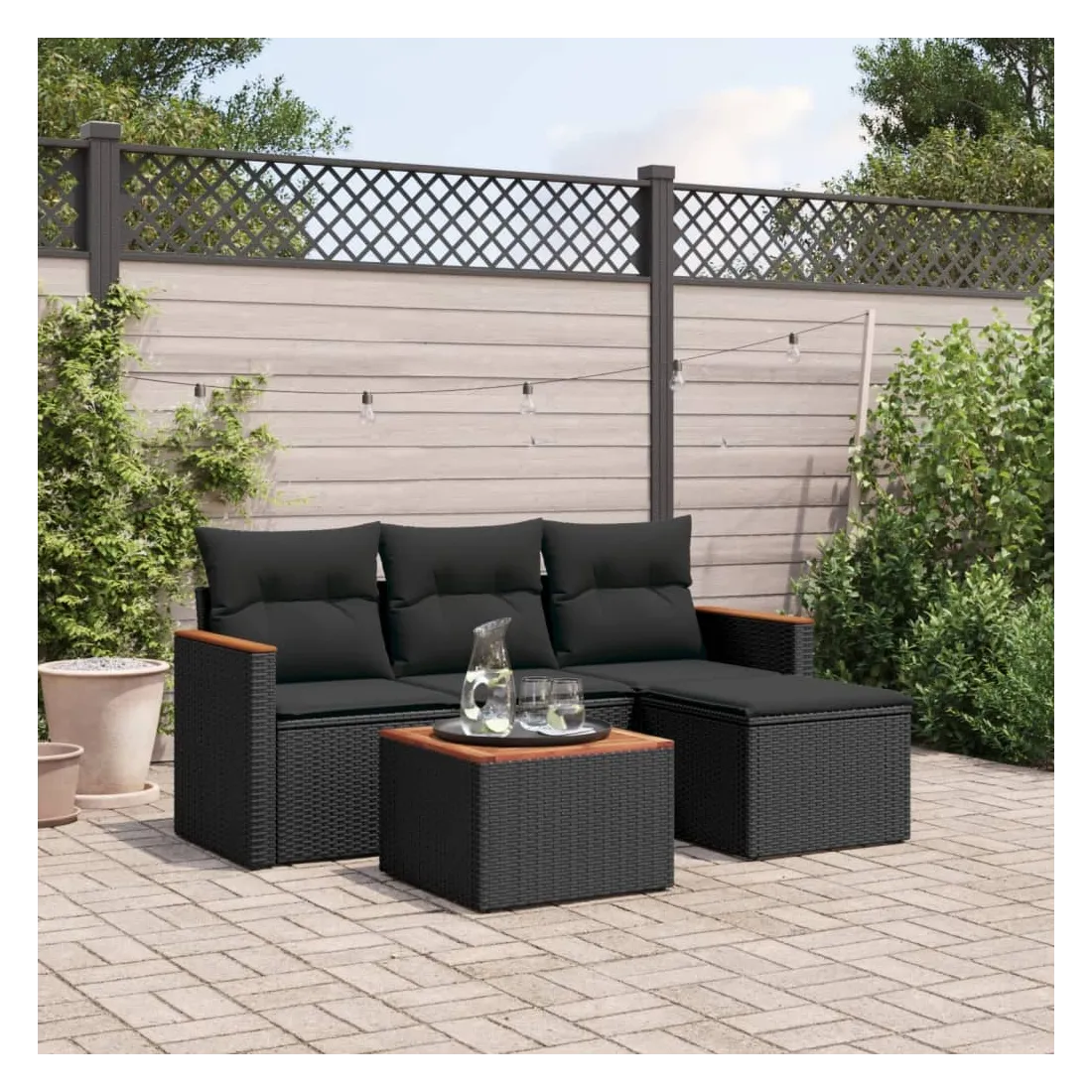 Cet ensemble de canapés de jardin est le complément parfait de votre arrière-cour, terrasse ou patio, offrant un espace confortable et accueillant pour discuter avec la famille et les amis ou simplement se détendre et profiter de l'extérieur. Matériau durable : la résine tressée, également connue sous le nom de poly rotin, est un matériau synthétique solide et nécessitant peu d'entretien qui ressemble au rotin naturel. Il est léger, facile à nettoyer et couramment utilisé pour les meubles d'extérieur en raison de sa durabilité et de ses propriétés de résistance aux intempéries.Dessus stable et facile à nettoyer : cette table de jardin a un dessus en bois d'acacia robuste, durable et facile à nettoyer avec un chiffon humide.Housse amovible et lavable : ces coussins de siège sont dotés de housses amovibles pour un lavage et un entretien faciles.Cadre robuste et stable : le cadre en acier enduit de poudre assure la solidité et la stabilité du meuble de jardin pour une utilisation quotidienne à l'extérieur.Conception modulaire : cet ensemble de meubles d'extérieur a une conception modulaire, ce qui le rend complètement flexible et facile à déplacer, afin que vous puissiez créer un agencement de meubles d'extérieur personnalisé. Bon à savoir :Pour que vos meubles d'extérieur restent beaux, nous vous recommandons de les protéger avec une housse imperméable.