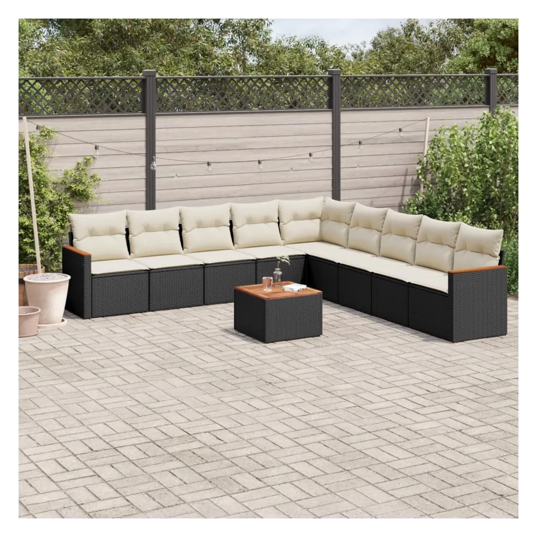 Cet ensemble de canapés de jardin est le complément parfait de votre arrière-cour, terrasse ou patio, offrant un espace confortable et accueillant pour discuter avec la famille et les amis ou simplement se détendre et profiter de l'extérieur. Matériau durable : la résine tressée, également connue sous le nom de poly rotin, est un matériau synthétique solide et nécessitant peu d'entretien qui ressemble au rotin naturel. Il est léger, facile à nettoyer et couramment utilisé pour les meubles d'extérieur en raison de sa durabilité et de ses propriétés de résistance aux intempéries.Dessus stable et facile à nettoyer : cette table de jardin a un dessus en bois d'acacia robuste, durable et facile à nettoyer avec un chiffon humide.Housse amovible et lavable : ces coussins de siège sont dotés de housses amovibles pour un lavage et un entretien faciles.Cadre robuste et stable : le cadre en acier enduit de poudre assure la solidité et la stabilité du meuble de jardin pour une utilisation quotidienne à l'extérieur.Conception modulaire : cet ensemble de meubles d'extérieur a une conception modulaire, ce qui le rend complètement flexible et facile à déplacer, afin que vous puissiez créer un agencement de meubles d'extérieur personnalisé. Bon à savoir :Pour que vos meubles d'extérieur restent beaux, nous vous recommandons de les protéger avec une housse imperméable.