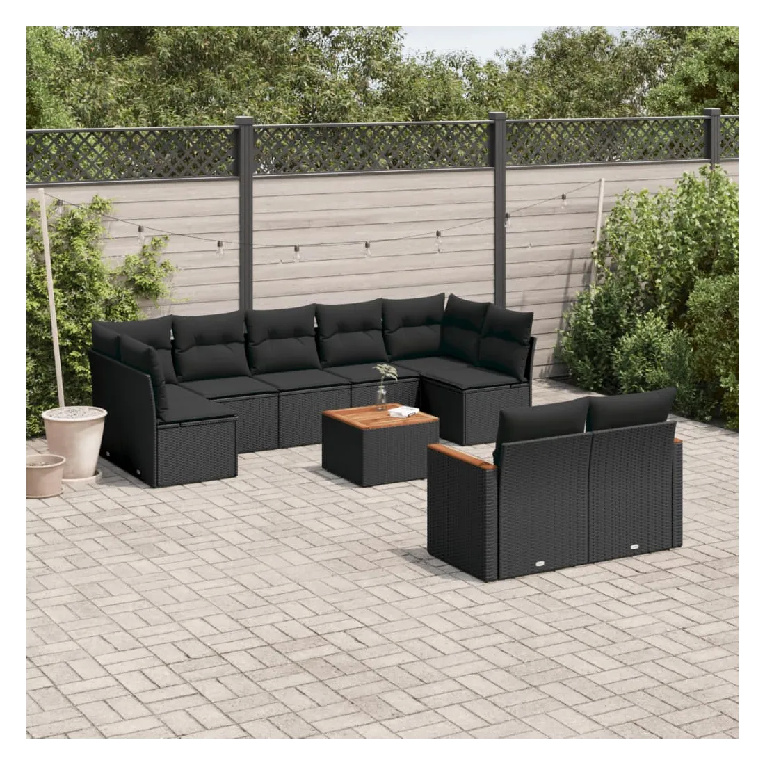 Cet ensemble de canapés de jardin est le complément parfait de votre arrière-cour, terrasse ou patio, offrant un espace confortable et accueillant pour discuter avec la famille et les amis ou simplement se détendre et profiter de l'extérieur. Matériau durable : la résine tressée, également connue sous le nom de poly rotin, est un matériau synthétique solide et nécessitant peu d'entretien qui ressemble au rotin naturel. Il est léger, facile à nettoyer et couramment utilisé pour les meubles d'extérieur en raison de sa durabilité et de ses propriétés de résistance aux intempéries.Dessus stable et facile à nettoyer : cette table de jardin a un dessus en bois d'acacia robuste, durable et facile à nettoyer avec un chiffon humide.Housse amovible et lavable : ces coussins de siège sont dotés de housses amovibles pour un lavage et un entretien faciles.Cadre robuste et stable : le cadre en acier enduit de poudre assure la solidité et la stabilité du meuble de jardin pour une utilisation quotidienne à l'extérieur.Conception modulaire : cet ensemble de meubles d'extérieur a une conception modulaire, ce qui le rend complètement flexible et facile à déplacer, afin que vous puissiez créer un agencement de meubles d'extérieur personnalisé. Bon à savoir :Pour que vos meubles d'extérieur restent beaux, nous vous recommandons de les protéger avec une housse imperméable.