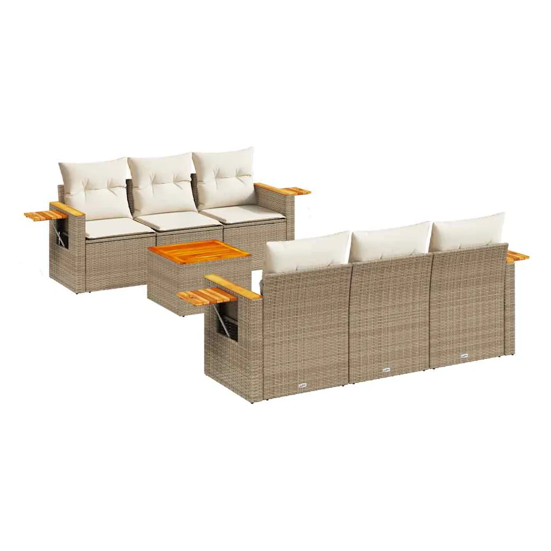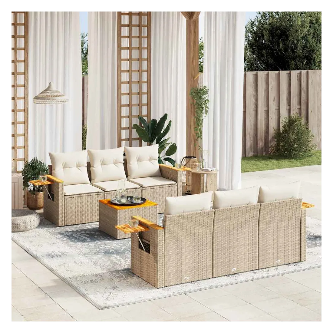 Cet ensemble de canapés de jardin est le complément parfait de votre arrière-cour, terrasse ou patio, offrant un espace confortable et accueillant pour discuter avec la famille et les amis ou simplement se détendre et profiter de l'extérieur. Matériau durable : la résine tressée, également connue sous le nom de poly rotin, est un matériau synthétique solide et nécessitant peu d'entretien qui ressemble au rotin naturel. Il est léger, facile à nettoyer et couramment utilisé pour les meubles d'extérieur en raison de sa durabilité et de ses propriétés de résistance aux intempéries.Dessus stable et facile à nettoyer : cette table de jardin a un dessus en bois d'acacia robuste, durable et facile à nettoyer avec un chiffon humide.Table d'appoint pratique : ce mobilier d'extérieur comprend une table d'appoint pliable avec un ressort à gaz sur les accoudoirs, offrant un endroit pratique pour garder vos essentiels à portée de main.Housse amovible et lavable : ces coussins de siège sont dotés de housses amovibles pour un lavage et un entretien faciles.Conception modulaire : cet ensemble de meubles d'extérieur a une conception modulaire, ce qui le rend complètement flexible et facile à déplacer, afin que vous puissiez créer un agencement de meubles d'extérieur personnalisé. Bon à savoir :Pour que vos meubles d'extérieur restent beaux, nous vous recommandons de les protéger avec une housse imperméable.