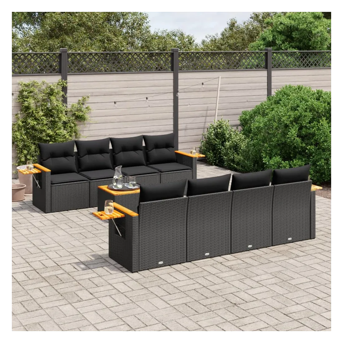 Cet ensemble de canapés de jardin est le complément parfait de votre arrière-cour, terrasse ou patio, offrant un espace confortable et accueillant pour discuter avec la famille et les amis ou simplement se détendre et profiter de l'extérieur. Matériau durable : la résine tressée, également connue sous le nom de poly rotin, est un matériau synthétique solide et nécessitant peu d'entretien qui ressemble au rotin naturel. Il est léger, facile à nettoyer et couramment utilisé pour les meubles d'extérieur en raison de sa durabilité et de ses propriétés de résistance aux intempéries.Dessus stable et facile à nettoyer : cette table de jardin a un dessus en bois d'acacia robuste, durable et facile à nettoyer avec un chiffon humide.Table d'appoint pratique : ce mobilier d'extérieur comprend une table d'appoint pliable avec un ressort à gaz sur les accoudoirs, offrant un endroit pratique pour garder vos essentiels à portée de main.Housse amovible et lavable : ces coussins de siège sont dotés de housses amovibles pour un lavage et un entretien faciles.Conception modulaire : cet ensemble de meubles d'extérieur a une conception modulaire, ce qui le rend complètement flexible et facile à déplacer, afin que vous puissiez créer un agencement de meubles d'extérieur personnalisé. Bon à savoir :Pour que vos meubles d'extérieur restent beaux, nous vous recommandons de les protéger avec une housse imperméable.