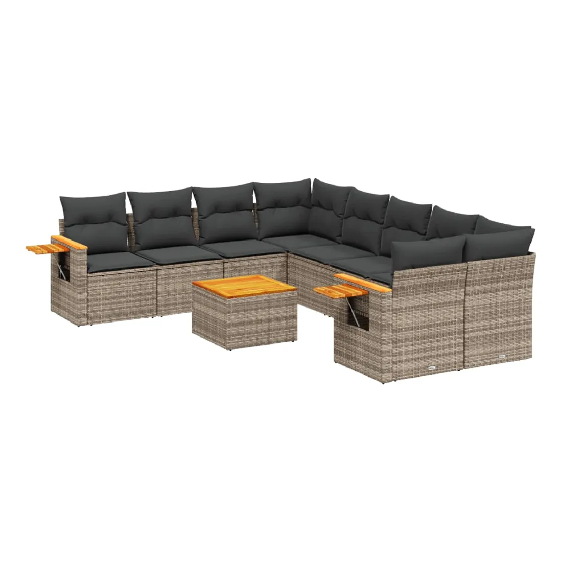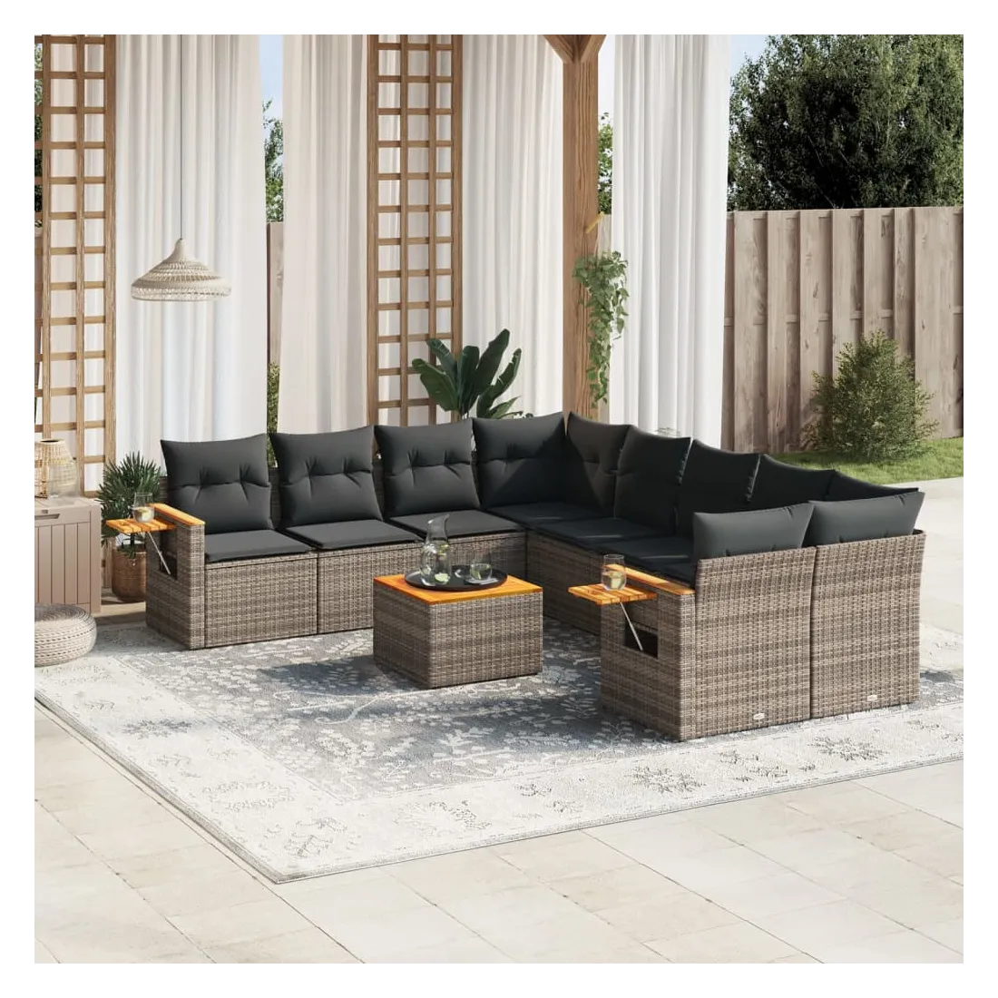 Cet ensemble de canapés de jardin est le complément parfait de votre arrière-cour, terrasse ou patio, offrant un espace confortable et accueillant pour discuter avec la famille et les amis ou simplement se détendre et profiter de l'extérieur. Matériau durable : la résine tressée, également connue sous le nom de poly rotin, est un matériau synthétique solide et nécessitant peu d'entretien qui ressemble au rotin naturel. Il est léger, facile à nettoyer et couramment utilisé pour les meubles d'extérieur en raison de sa durabilité et de ses propriétés de résistance aux intempéries.Dessus stable et facile à nettoyer : cette table de jardin a un dessus en bois d'acacia robuste, durable et facile à nettoyer avec un chiffon humide.Table d'appoint pratique : ce mobilier d'extérieur comprend une table d'appoint pliable avec un ressort à gaz sur les accoudoirs, offrant un endroit pratique pour garder vos essentiels à portée de main.Housse amovible et lavable : ces coussins de siège sont dotés de housses amovibles pour un lavage et un entretien faciles.Conception modulaire : cet ensemble de meubles d'extérieur a une conception modulaire, ce qui le rend complètement flexible et facile à déplacer, afin que vous puissiez créer un agencement de meubles d'extérieur personnalisé. Bon à savoir :Pour que vos meubles d'extérieur restent beaux, nous vous recommandons de les protéger avec une housse imperméable.