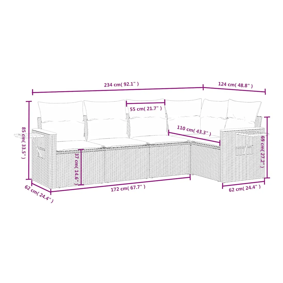 Cet ensemble de canapés de jardin est le complément parfait de votre arrière-cour, terrasse ou patio, offrant un espace confortable et accueillant pour discuter avec la famille et les amis ou simplement se détendre et profiter de l'extérieur. Matériau durable : la résine tressée, également connue sous le nom de poly rotin, est un matériau synthétique solide et nécessitant peu d'entretien qui ressemble au rotin naturel. Il est léger, facile à nettoyer et couramment utilisé pour les meubles d'extérieur en raison de sa durabilité et de ses propriétés de résistance aux intempéries.Table d'appoint pratique : ce mobilier d'extérieur comprend une table d'appoint pliable avec un ressort à gaz sur les accoudoirs, offrant un endroit pratique pour garder vos essentiels à portée de main.Housse amovible et lavable : ces coussins de siège sont dotés de housses amovibles pour un lavage et un entretien faciles.Conception modulaire : cet ensemble de meubles d'extérieur a une conception modulaire, ce qui le rend complètement flexible et facile à déplacer, afin que vous puissiez créer un agencement de meubles d'extérieur personnalisé. Bon à savoir :Pour que vos meubles d'extérieur restent beaux, nous vous recommandons de les protéger avec une housse imperméable.